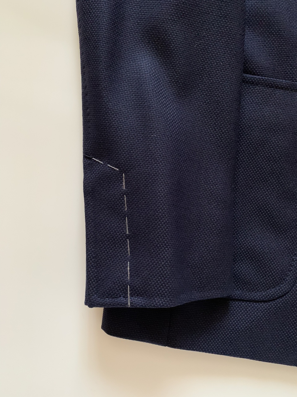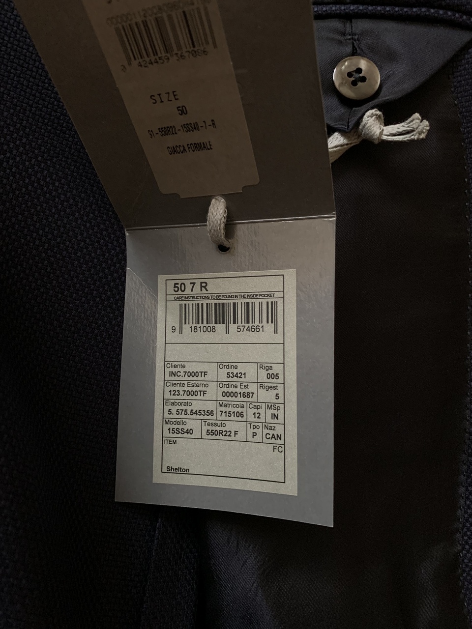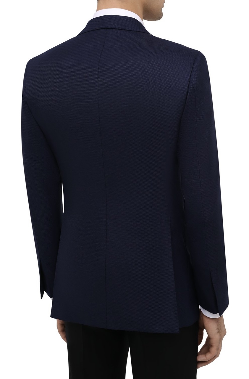 Дизайнер включил в классическую коллекцию однобортный шерстяной пиджак тёмно-синего цвета.Для пошива приталенной модели мастера марки использовали мягкую фактурную шерсть,которая хорошо держит форму и меньше пачкается.Изделие с двумя накладными карманами,кармашек на груди,застёгивается на две пуговицы золотистого цвета.Подкладка выполнена из ткани купро с добавлением шёлка.Разрез сзади.