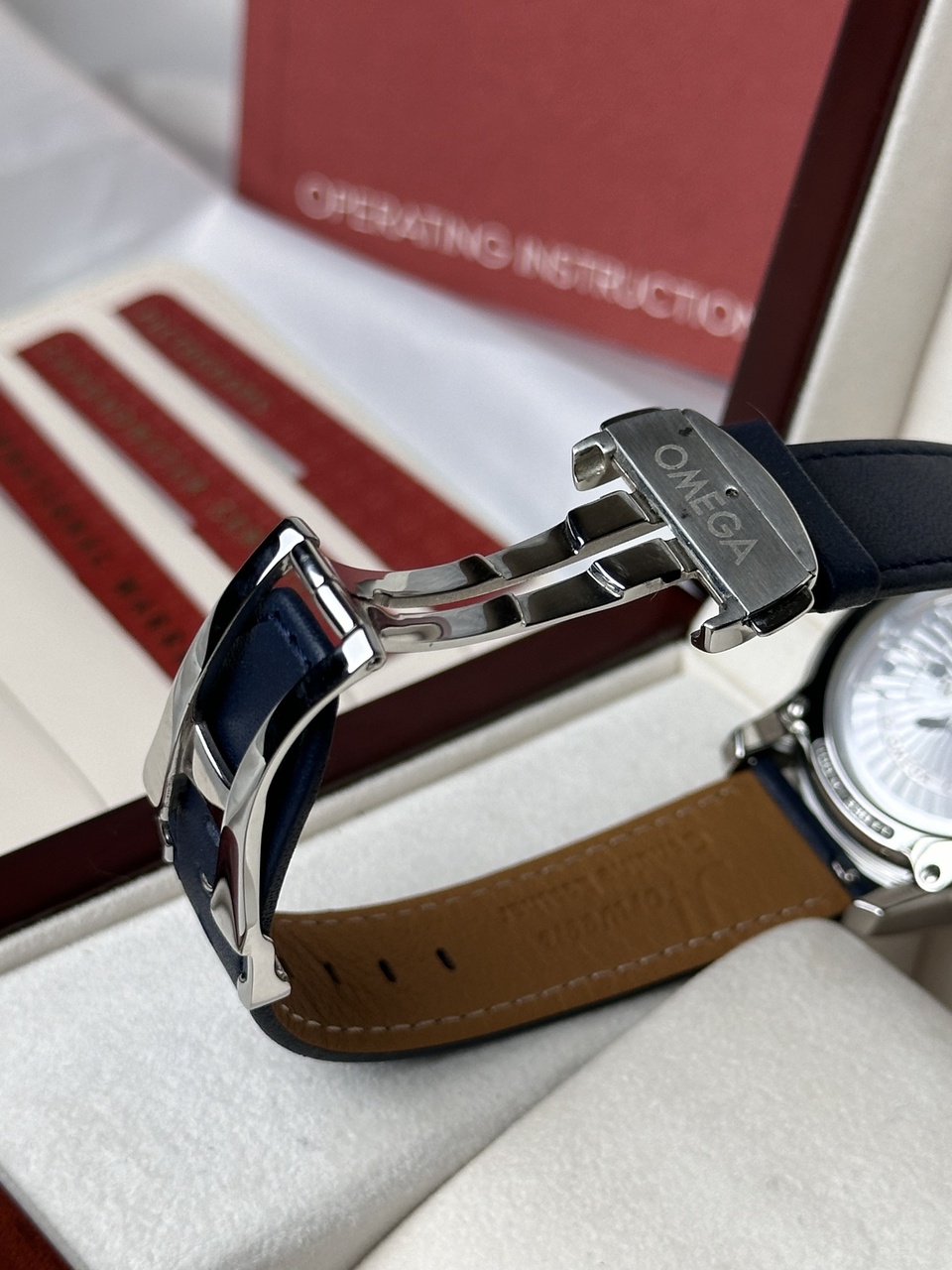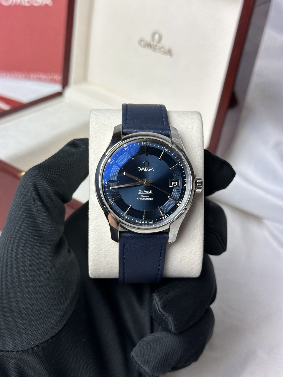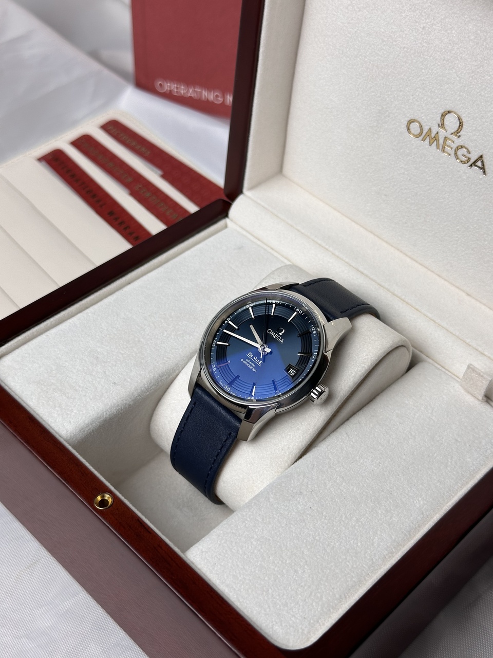Часы OMEGA De Ville Hour Vision Blue выделяются своим элегантным синим циферблатом с прекрасной геометрией по его краям и стрелками из 18-каратного белого золота для часов, минут и секунд.