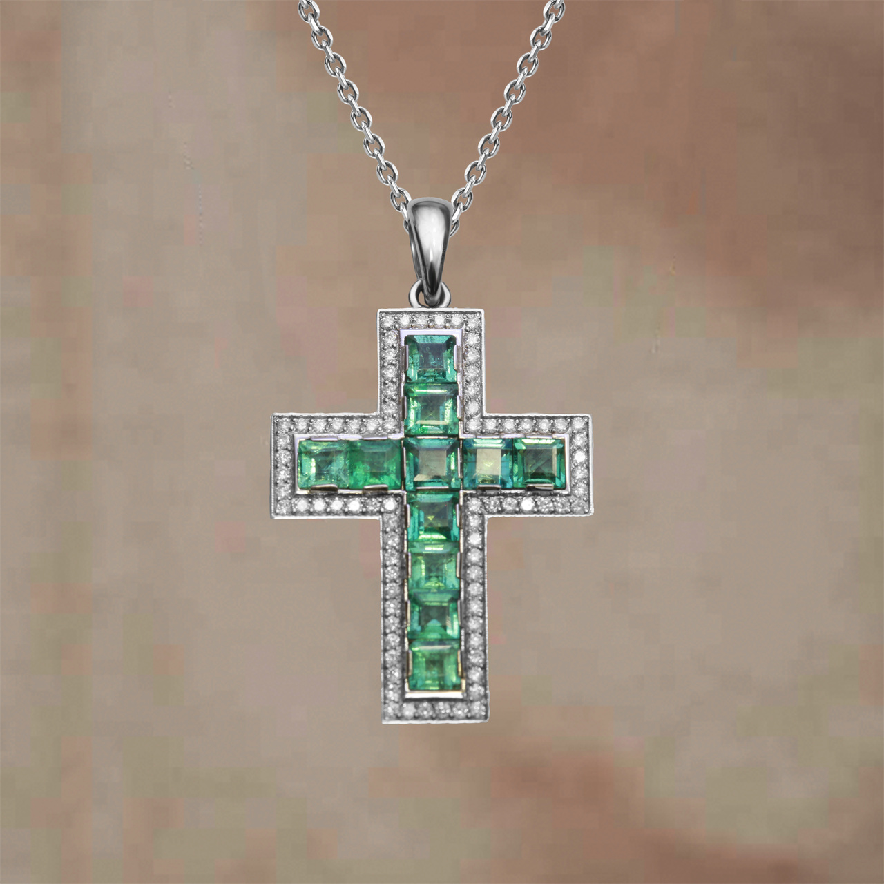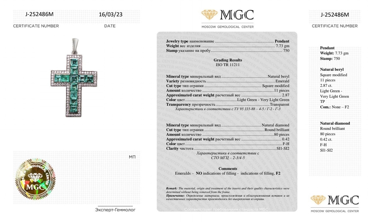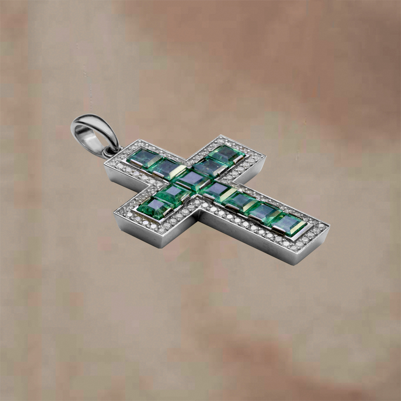 Подвеска-крест из белого золота с изумрудами 2,87 карат и бриллиантами 0,42 карат (сертификат МГЦ)