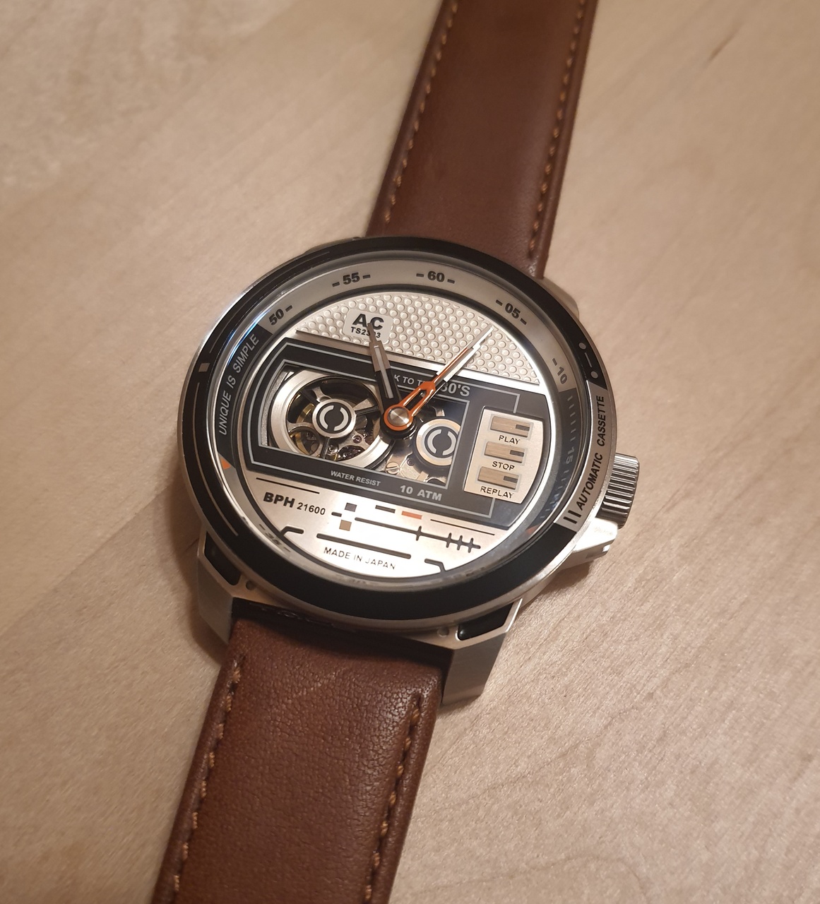 Основная фишка часов - их дизайн. Циферблат серебристый (хоть и кажется белым), изображает магнитофон с аудио-кассетой. При этом одна из кассетных катушек представляет собой окошко, через которое видна спираль баланса, создающая ощущение работающего мафона.