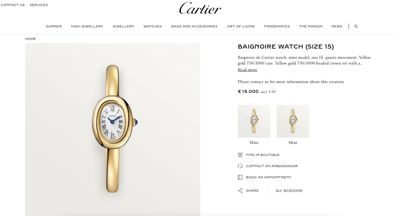 ЖЕНСКИЕ *CARTIER* BAIGNOIRE MINI QUARTZ, YELLOW GOLD WGBA0018 (SIZE 15)