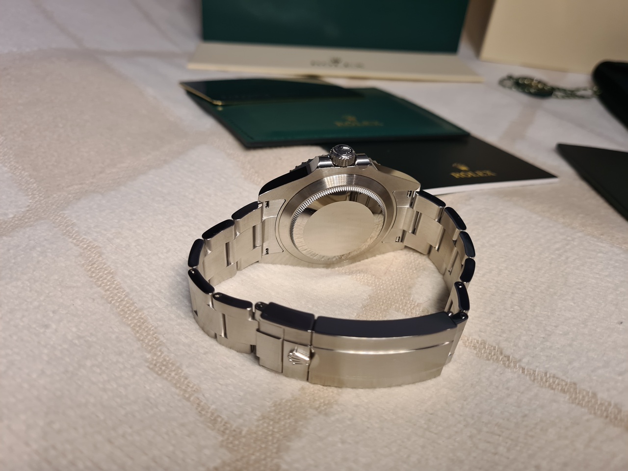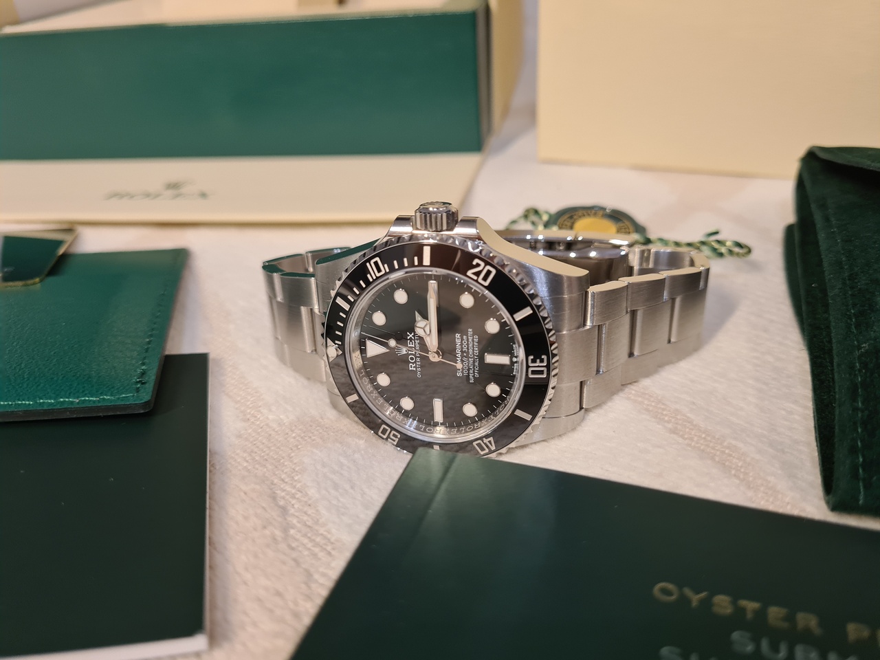 выставляю на продажу свои часы Rolex Submariner (No Date) ref. 124060, которые купил в сентябре 2024 года в бутике Rolex и надевал на руку лишь только в момент покупки и уже дома в качестве пробы, чтобы попытаться сначала привыкнуть к ним. Когда покупал эти часы, предполагал, что перейду на них со своих Datejust, которые ношу уже несколько лет, практически не снимая и уже не ощущая их на руке, но к сожалению, так и не получилось мне привыкнуть к новым часам. К тому же считаю, что часы должны носиться, а не лежать в коробке.