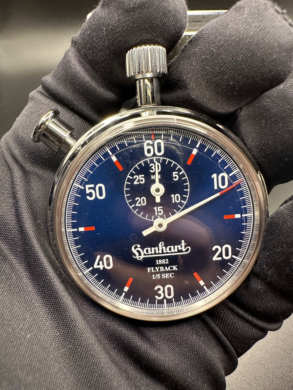 В секундомере, также как и часы, с функцией Flayback установлен собственный механизм Hanhart — caliber 122, стекло секундомера пластиковое.