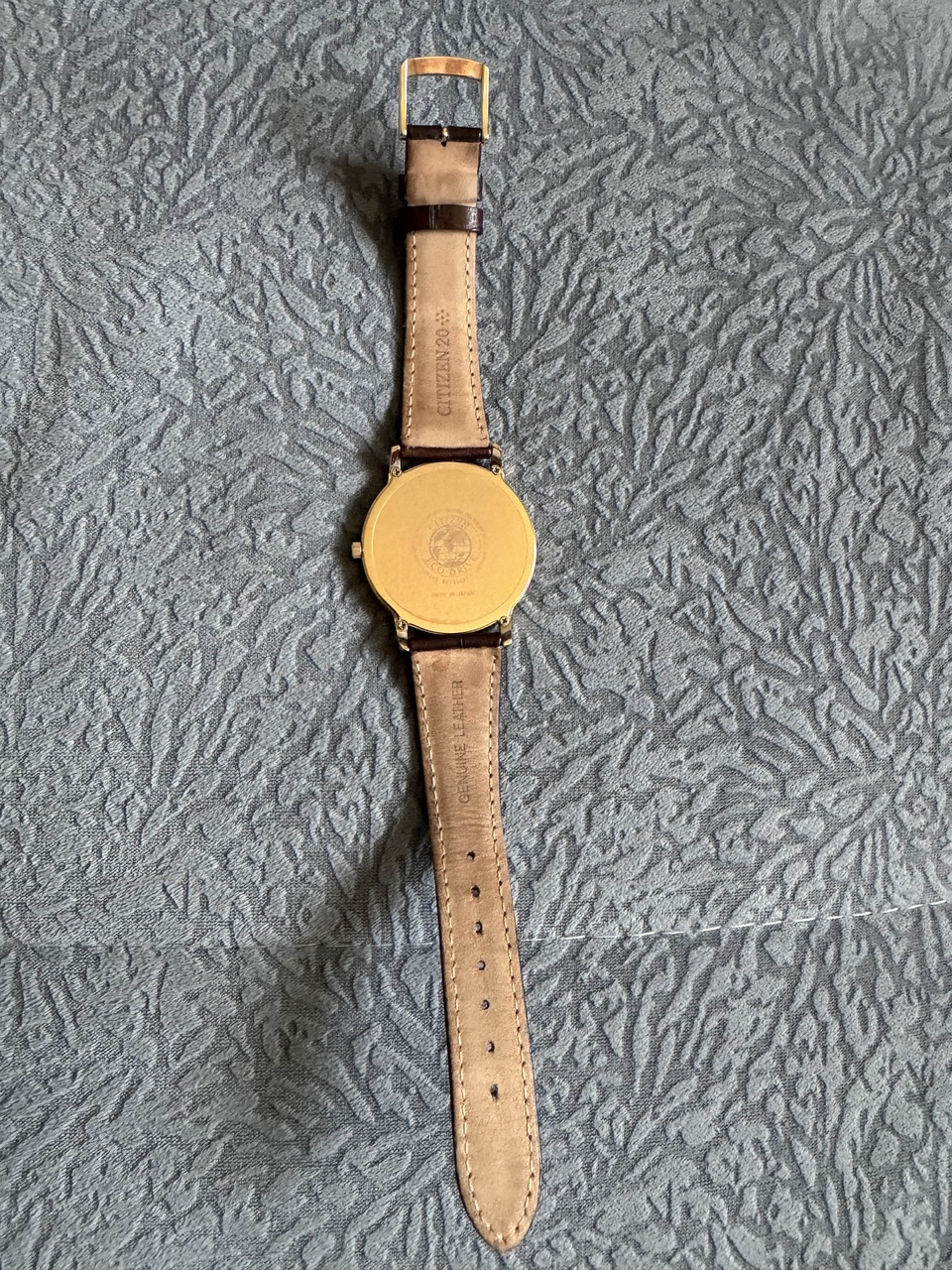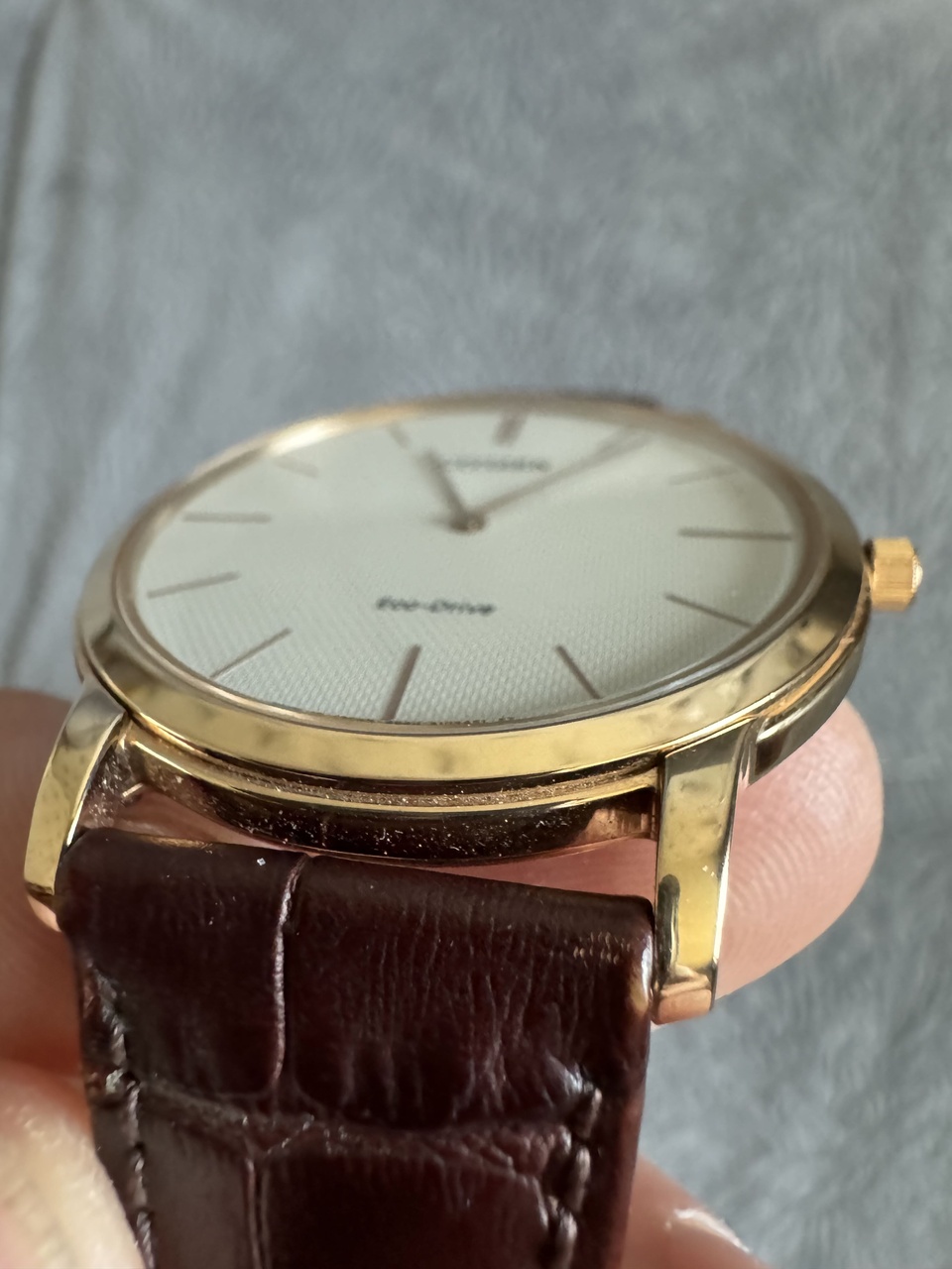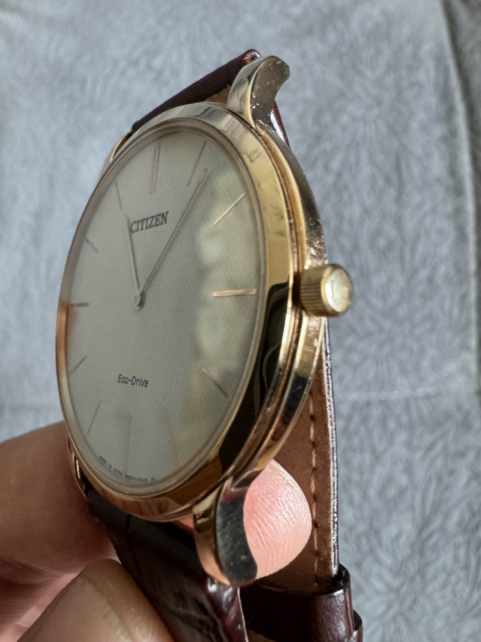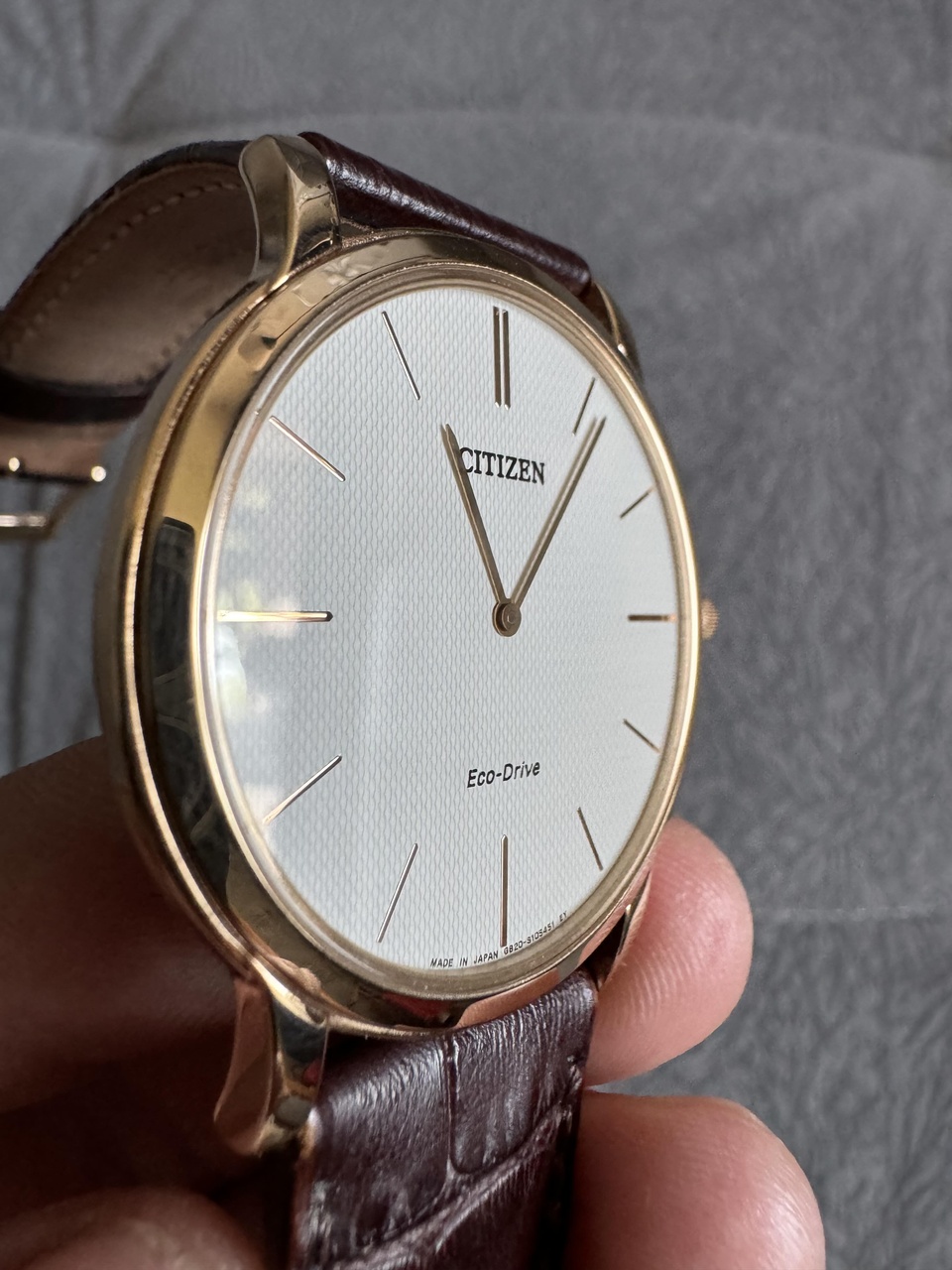 Ультратонкая классика. Без суеты. Минимализм. Стекло сапфир. Накладные метки. Калибр G872 (Eco-drive) заряжается от любого источника света. Стальной корпус с золотым PVD покрытием. Отличный вариант под костюм. Или ультралегкий вариант на лето, но водозащита 30 метров. В "тытрубе" их давили на 50 отчаянные блогеры, но это не повод в них нырять. Деликатная вещь. Там же, в "тытрубе" полно видеороликов, смотрите на здоровье по: AR1113-12A, Citizen Stiletto, G872.