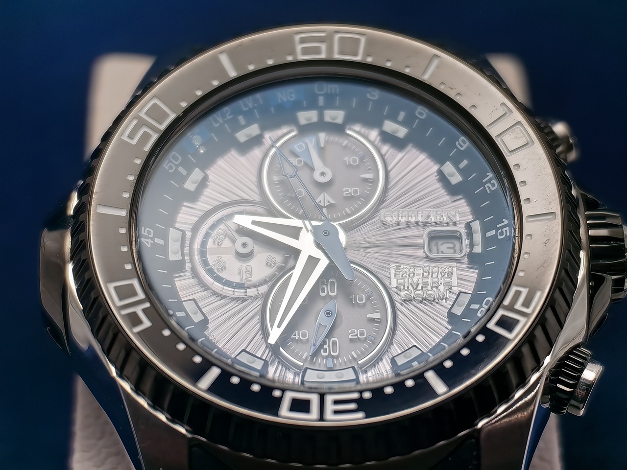 Минутная разметка белой краской нанесена по периметру циферблата на наклонной вставке колодца, имеющего зубчатые выступы соответствующие часовым меткам. Часовые метки имеют трапециевидные отпечатки белой краской, в центре которых имеется точка люминофора. Поле циферблата вероятно изготовлено из полупрозрачного пластика(или стекла?), с расходящимися из центра лучами, как в мультфильмах Аниме. Два из трех малых циферблатов расположены вертикально и обозначены серебристой рамкой, третий без оформления. Верхний циферблат отвечает за глубиномер и имеет шкалу от 0 до 50(метров), средний левый циферблат показывает время в 24х часовом формате, и нижний циферблат – секундный. Окошко даты прямоугольное, оформлено белой рамкой. На циферблате имеются надписи белой краской: Citizen, Eco-Drive, Diver's, 200m. Часовая и минутная стрелка серебристые, двухгранные, имеют клиновидную форму , значительно расширяясь к основанию. Секундная стрелка малого циферблата, ярко голубого цвета , стрелка глубиномера белая, клиновидная. И , наконец большая стрелка глубиномера скелетизирована, окрашена в голубой цвет, имеет заметную хвостовую часть, и острый треугольный кончик с нанесенным люминофором.