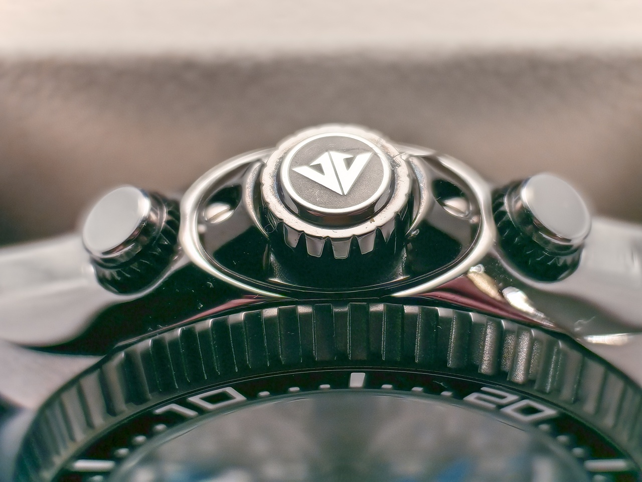 Технические характеристики: Массивный корпус из нержавеющей стали имеет диаметр 45мм, с заводной головкой 50,5мм, от ушка до ушка 51мм, между ушек 23мм, толщина корпуса 15,5мм. Обработка корпуса великолепна, боковые стороны хорошо полированы, верхняя сторона шелково сатинирована, нижняя сторона - чистовое браширование. Безель на 120 кликов, вероятно стальной, имеет наклонные стенки с редкими аккуратными зубчиками. Поверхность безеля матированная имеет цвет черного воронения с теплым отблеском. Верхняя часть безеля, имеет наклон внутрь, как воронка, где установлена напоминающая керамическую, - вставка, с выгравированными основными минутными обозначениями. Углубления обозначений заполнены белой краской. Стекло над циферблатом полукупольное, минеральное.