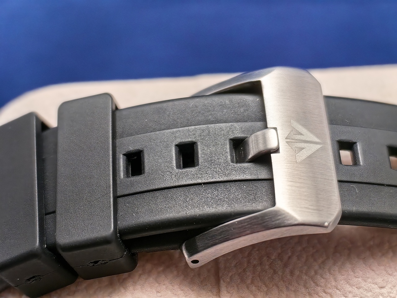 Каучуковый ремешок, выполненный именно под эти часы и имеющий ширину 23мм, свою функцию выполняет, но визуально кажется, что для такого массивного корпуса не хватает толщины самому ремешку. К особенностям я бы отнес заднюю крышку с пятью выемками под ключ, открыть её можно но сложно. Крышка затянута на совесть, по крайней мере, в домашних условиях у меня, её открыть не получилось, необходимо жестко и надежно фиксировать часы.