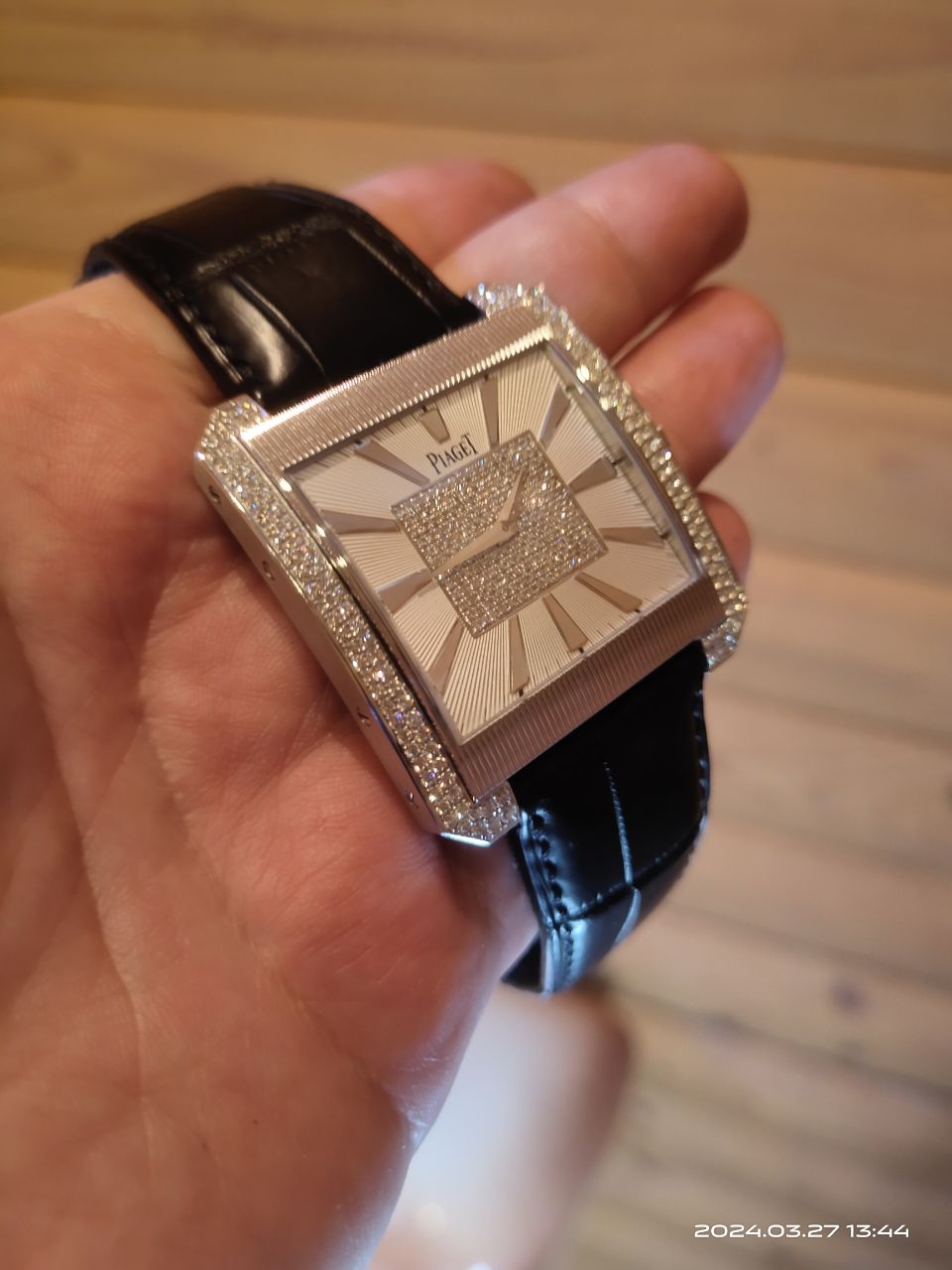 Механика с ручным заводом на сверхтонком мануфактурном механизме Piaget. Толщина механизма всего 2.5мм. Часы крупные 46x44mm, но при этом очень тонкие и отлично сидят на запястье благодаря изогнутому по форме руки корпусу. Корпус и застежка - белое золото 750 пробы. Метки и стрелки тоже золотые. Роскошный фирменный ремень из аллигатора. Чистейшие заводские бриллианты на корпусе и циферблате. Полный комплект. Часы куплены в Монте Карло в 2020 году. Обслужены в известной часовой мастерской в Москве. В идеальном состоянии. Общий вес часов 128 грамм.