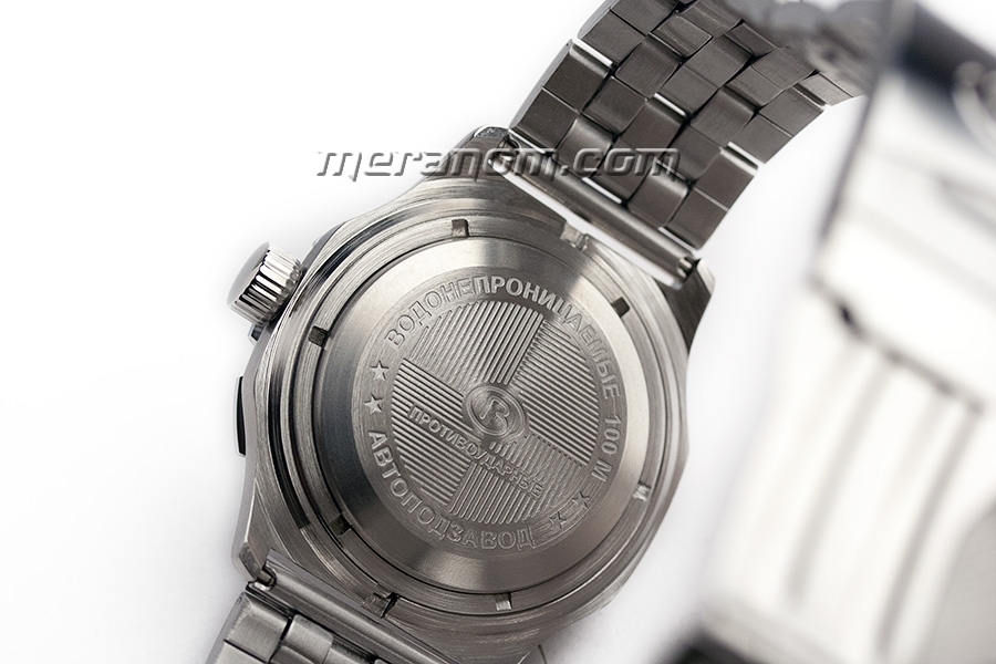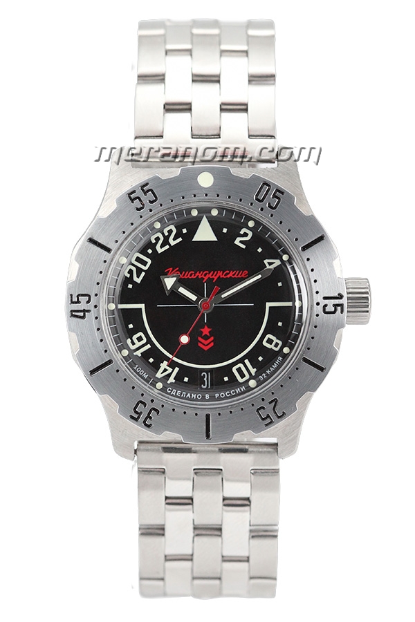 Командирские К-35; механизм 2431; механический механизм с автоподзаводом (АПЗ); запас хода 31 час; точность хода -20+60 секунд в сутки; 32 рубиновых камня; пластиковое (плексигласс, органическое) стекло; водозащита 100 метров (10 атмосфер); завинчивающаяся заводная головка (ЗГ, корона); завинчивающаяся кольцом задняя крышка из нержавеющей стали; противоударное устройство узла баланса; матовый (сатинированный) вращающийся пронумерованный безель; люм точки на цифере, стрелках и точка на безеле; матовый (сатинированный) корпус из нержавеющей стали; диаметр корпуса часов 42мм; расстояние между ушками (лапами) корпуса для браслета 22мм, толщина часов 15мм, срок службы – 10 лет, заводская гарантия 12 месяцев.
