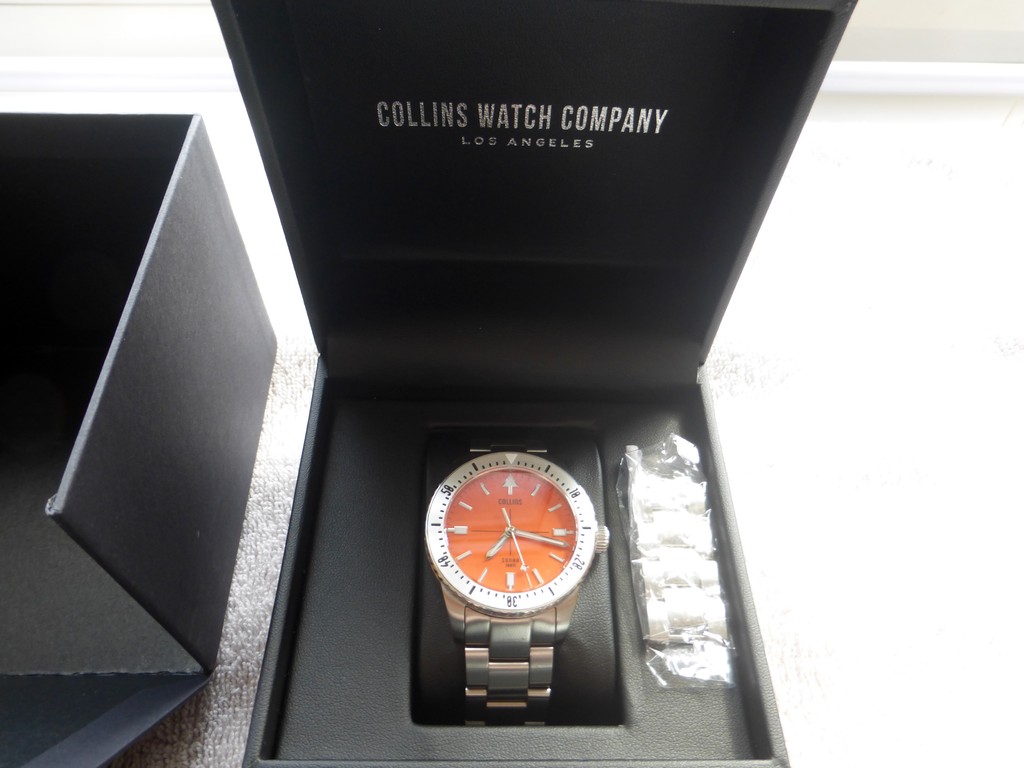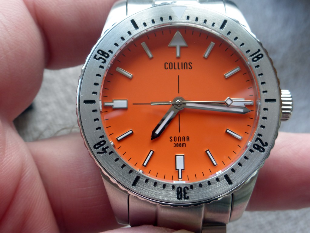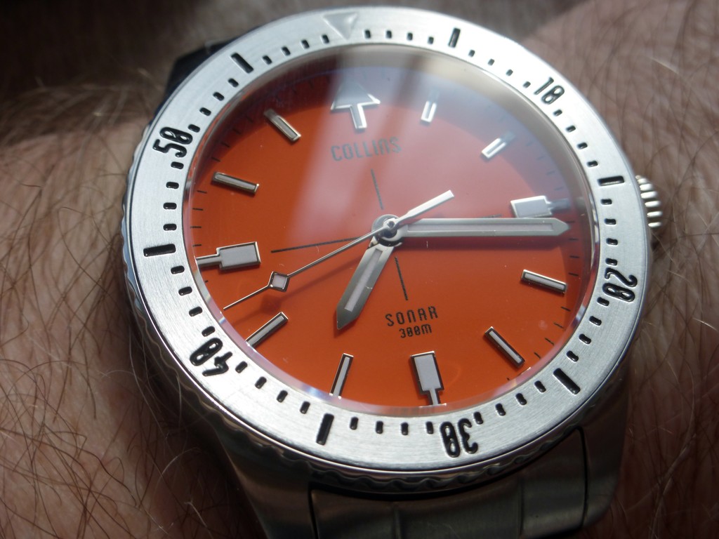 Часы Collins Sonar, сборка США ( Лос-Анджелес), механизм швейцарский, автоматический Sellita SW-200 Swiss ( регулируемый в 6-ти положениях) ! Водозащита 300 м (30 атм) ! Цвет циферблата насыщенный оранжевый (Pantone 165 C) Размеры 39.5mm Диаметр / 47.5mm высота / 12mm толщина / 20mm по ушкам. Люм швейцарский синий Super-LumiNova BGW9. Безель дайверский однонапрвленный на 120 кликов. Браслет с дайверской застежкой со стопором, сталь 316L, накладные часовые метки с полированными гранями!