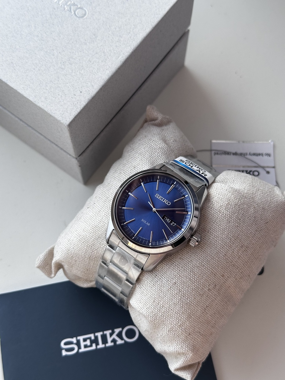 - Шикарный синий циферблат с накладными метками и логотипом.
