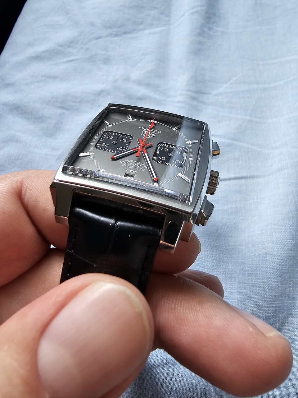 Для этой версии легендарного хронографа Monaco специалисты TAG Heuer сделали выбор в пользу серого рутениевого циферблата с матовой отделкой, к которому подобран черный ремешок из кожи аллигатора.