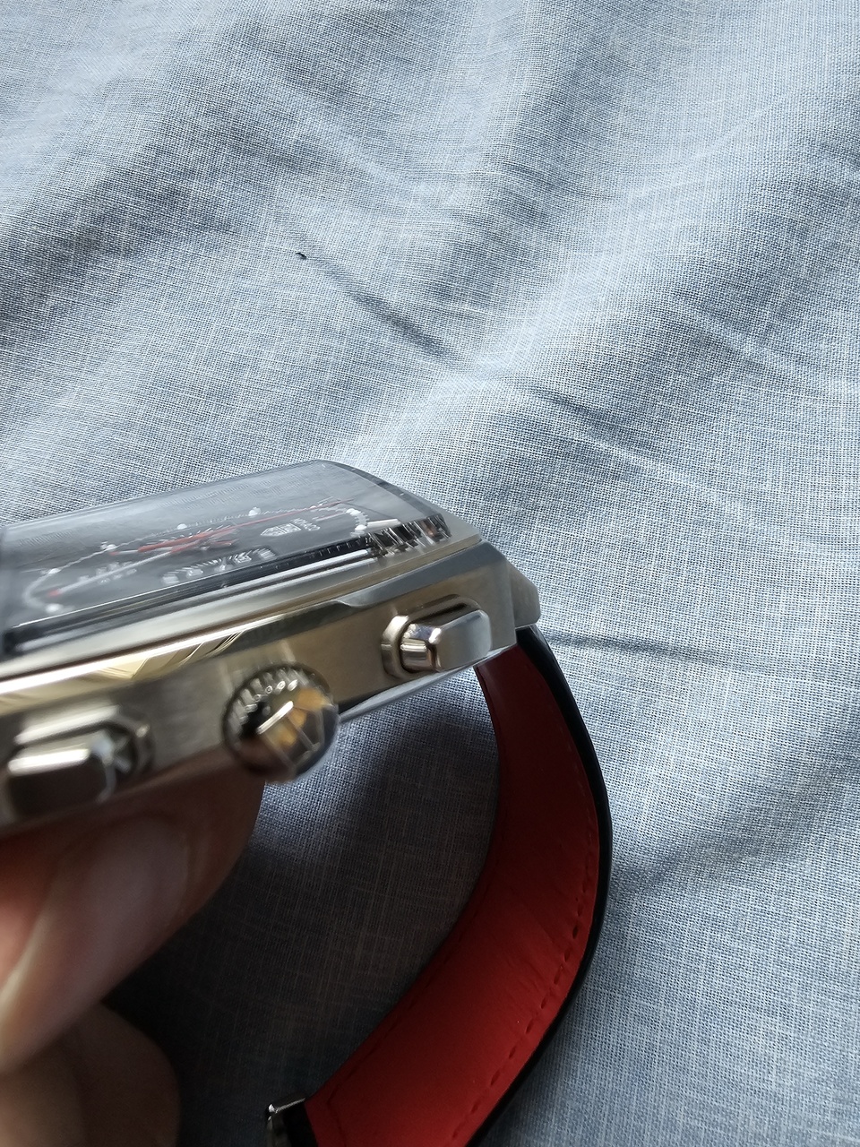 Рутений – 44-й элемент в таблице Менделеева, входит в платиновую группу. В зависимости от освещения может иметь разный цвет, от сияющего серебристо-белого до приглушенного матово-серого. Опало-черные счетчики хронографа дают выразительный контраст с меняющимся цветом металла. Красный цвет, которым выделены центральная стрелка, метка в районе «12 часов» и кончики часовой и минутной стрелок, делает образ часов более динамичным.