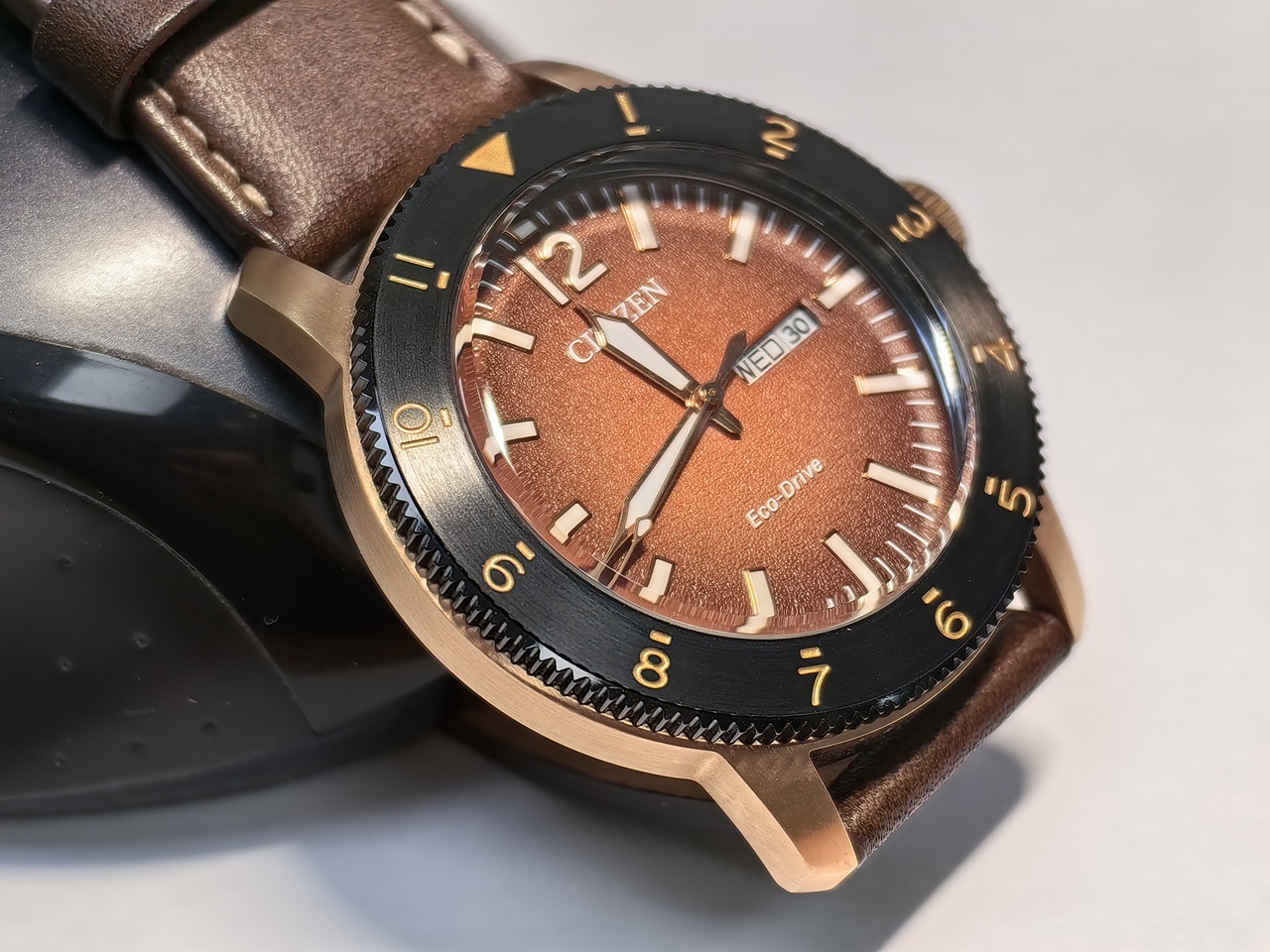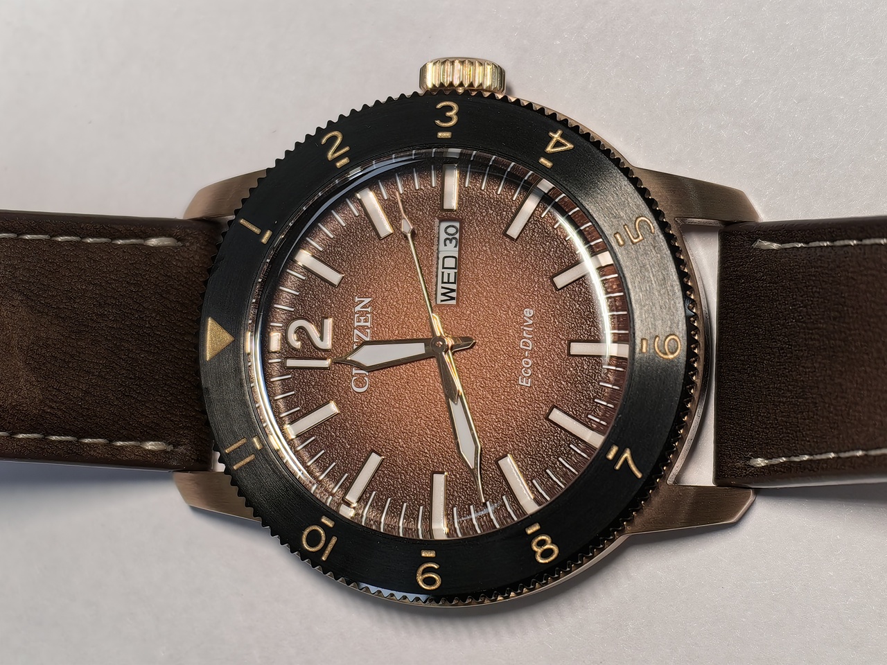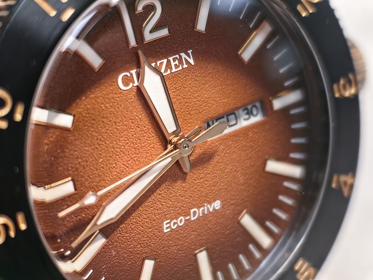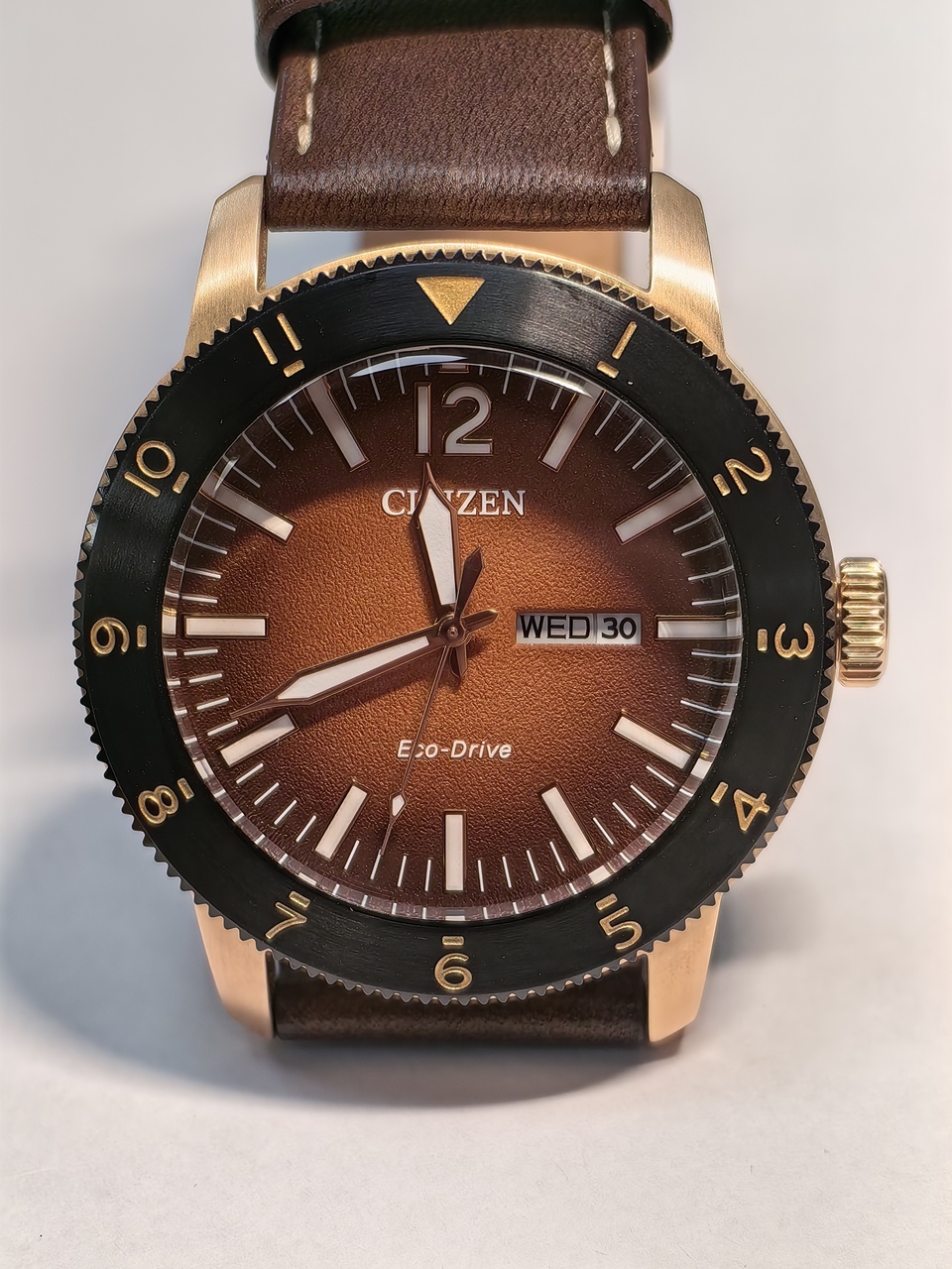 Циферблат плоский с поверхностью, имеющей рельеф «манной каши». Окраска циферблата градиентная, от оранжево- коричневого в центре, до шоколадного к краю. Часовые метки накладные, выполнены в виде прямоугольных золотых оправок, заполненных люминофорным составом средней интенсивности свечения. Метка 12 часов, так и прописана цифрой в соответствующей оправе. Надписи на циферблате: Citizen, Eco-Drive, а, также минутная шкала, выполнены белой краской по имеющемуся рельефному изображению. На циферблате есть неоформленное окошко даты/дня недели , рядом с меткой трех часов.