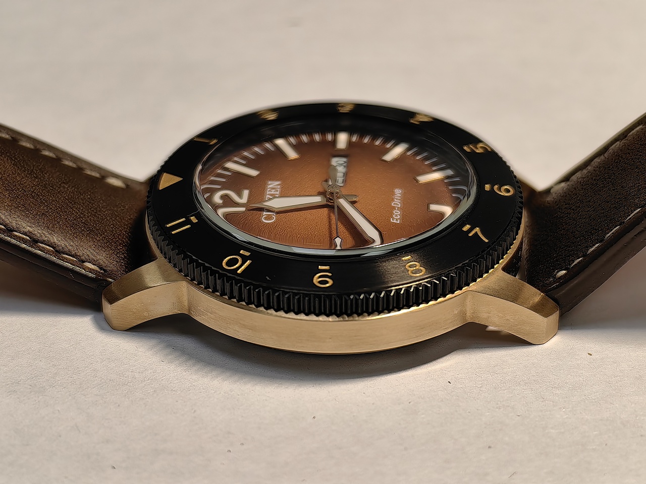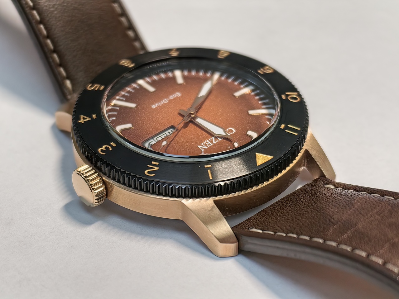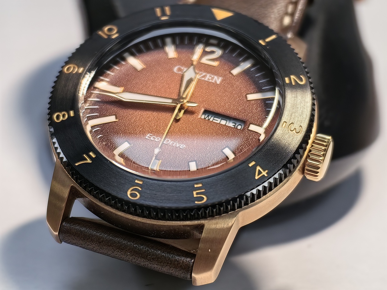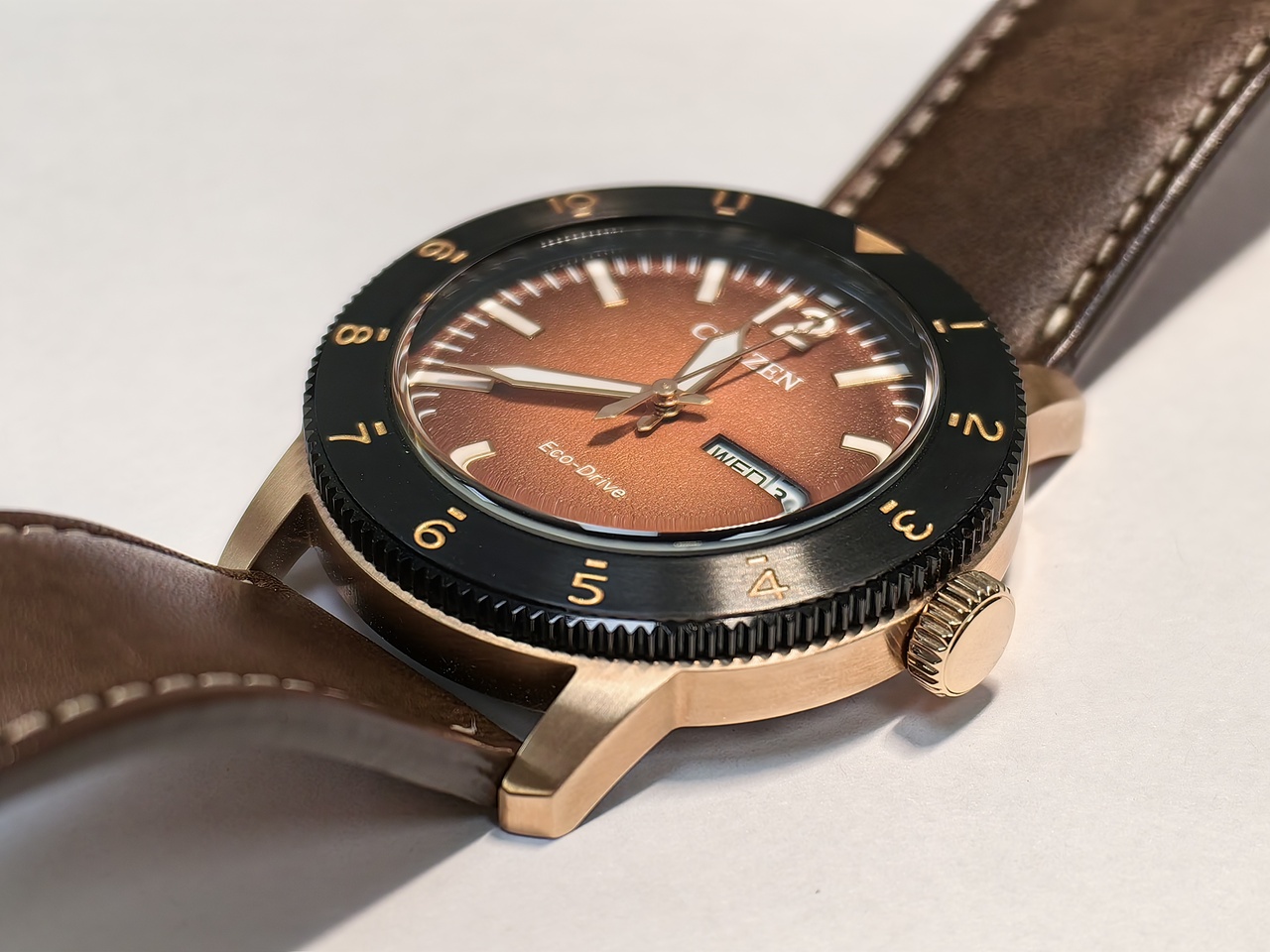 Циферблат плоский с поверхностью, имеющей рельеф «манной каши». Окраска циферблата градиентная, от оранжево- коричневого в центре, до шоколадного к краю. Часовые метки накладные, выполнены в виде прямоугольных золотых оправок, заполненных люминофорным составом средней интенсивности свечения. Метка 12 часов, так и прописана цифрой в соответствующей оправе. Надписи на циферблате: Citizen, Eco-Drive, а, также минутная шкала, выполнены белой краской по имеющемуся рельефному изображению. На циферблате есть неоформленное окошко даты/дня недели , рядом с меткой трех часов.