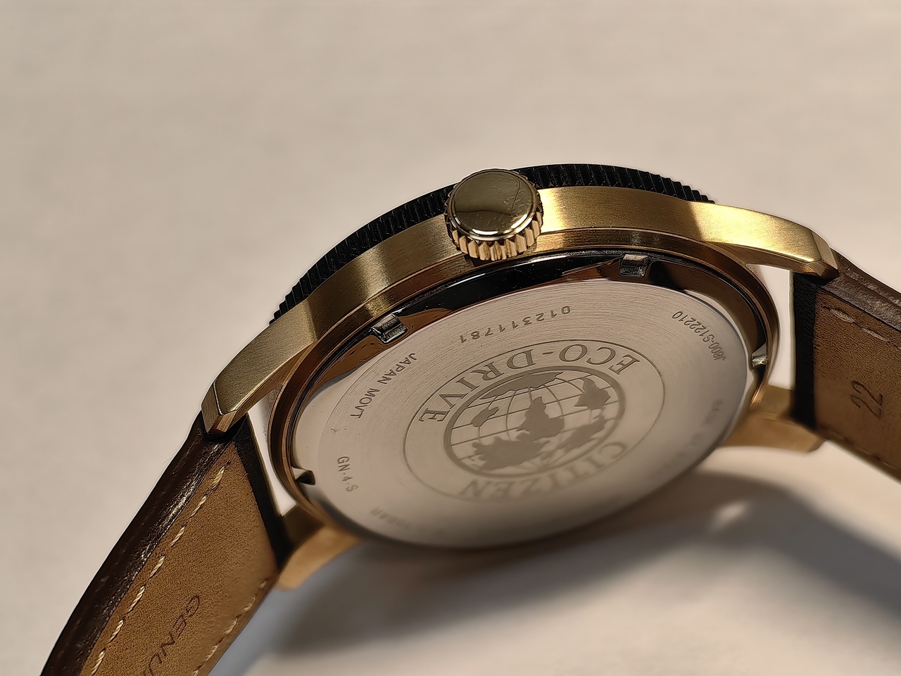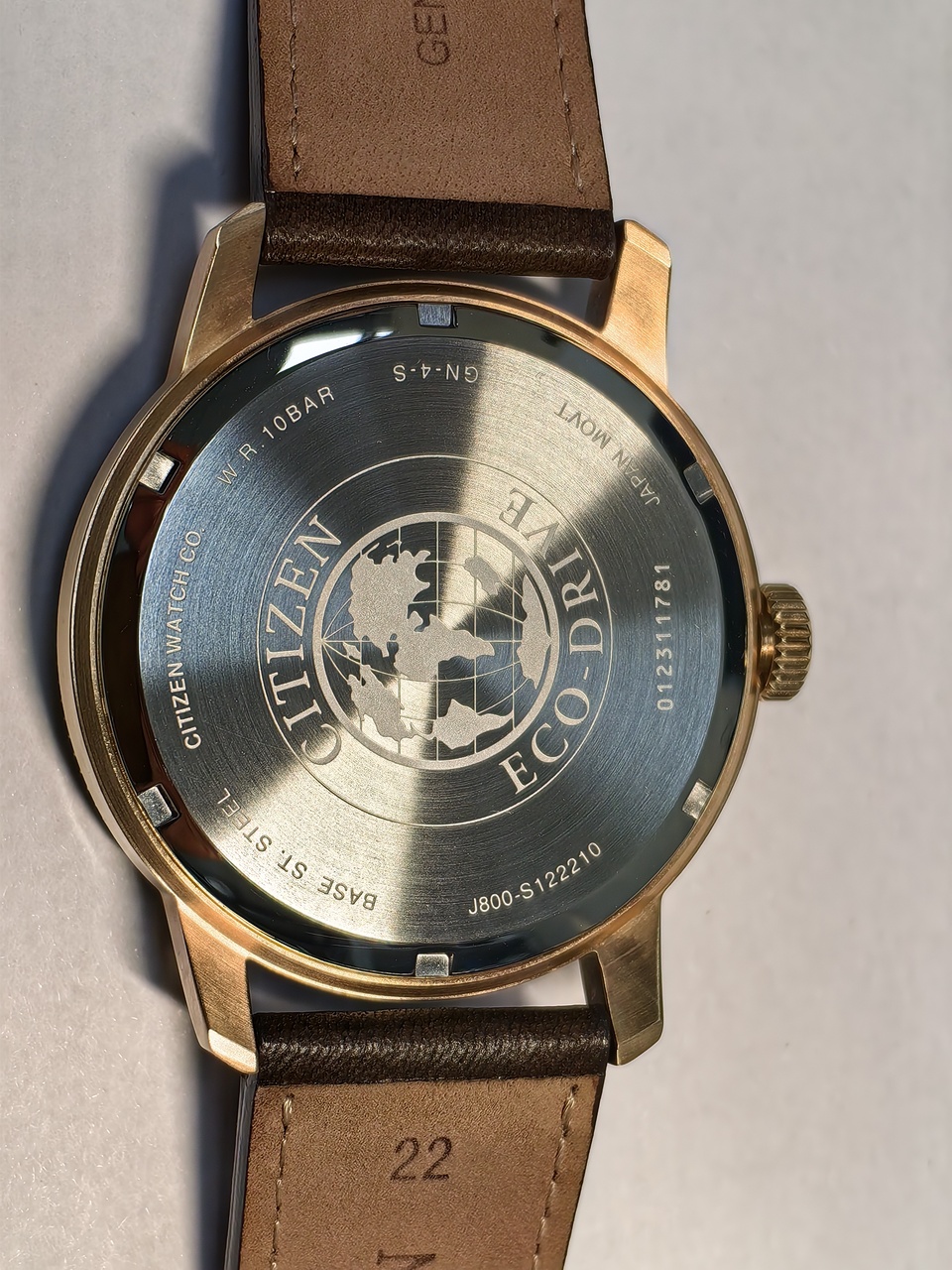 Задняя крышка часов завинчивающаяся, плоская, сатинированная. По периметру крышки неглубоко гравированы надписи: Citizen, Eco Drive, base st.steel, citizen watch co., w.r. 10 bar, G N -4-S, Japan mov’t. В центре крышки изображен земной шар в виде контурной карты.