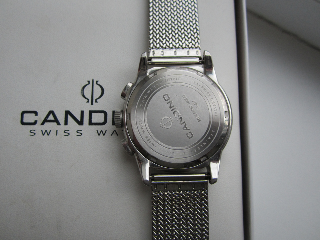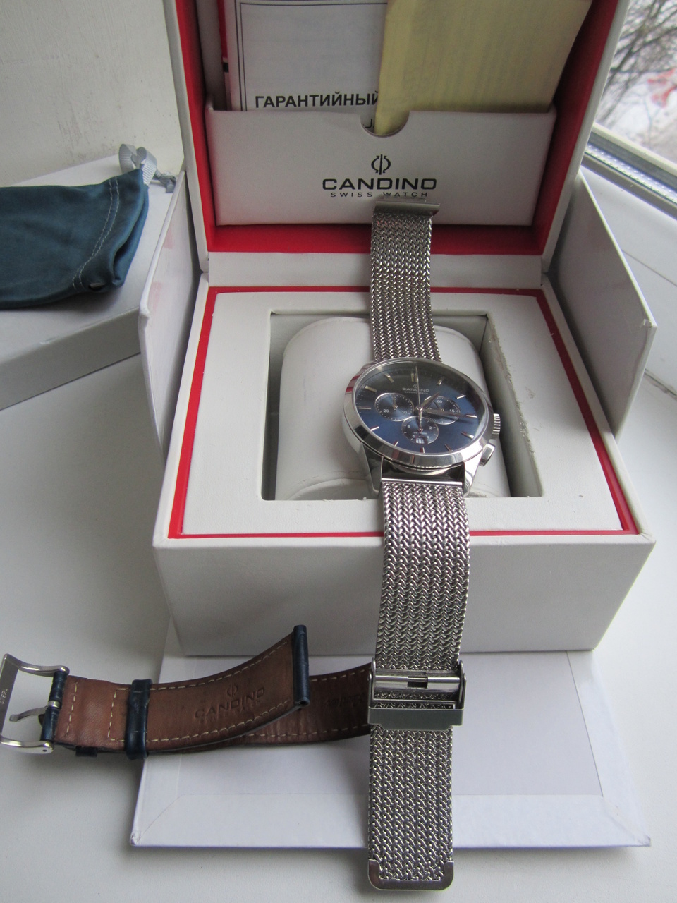 Хронограф CANDINO, кварц с возможностью измерений до 1/10 сек. Размер 41 мм., ремень 22 мм, стекло сапфир. Состояние хорошее, естественные следы носки на корпусе (мелкие царапки), стекло чистое. Оригинальный ремешок в комплекте, бонусом новый меш-браслет, который очень идёт к часам. Часы очень красивые - глубокий синий цвет циферблата с отделкой san-ray эффектно сочетается с накладными металлическими элементами. По технической части без проблем. Комплект полный. Отправлю почтой или СДЭКОМ после оплаты стоимости часов и доставки по номеру телефона.