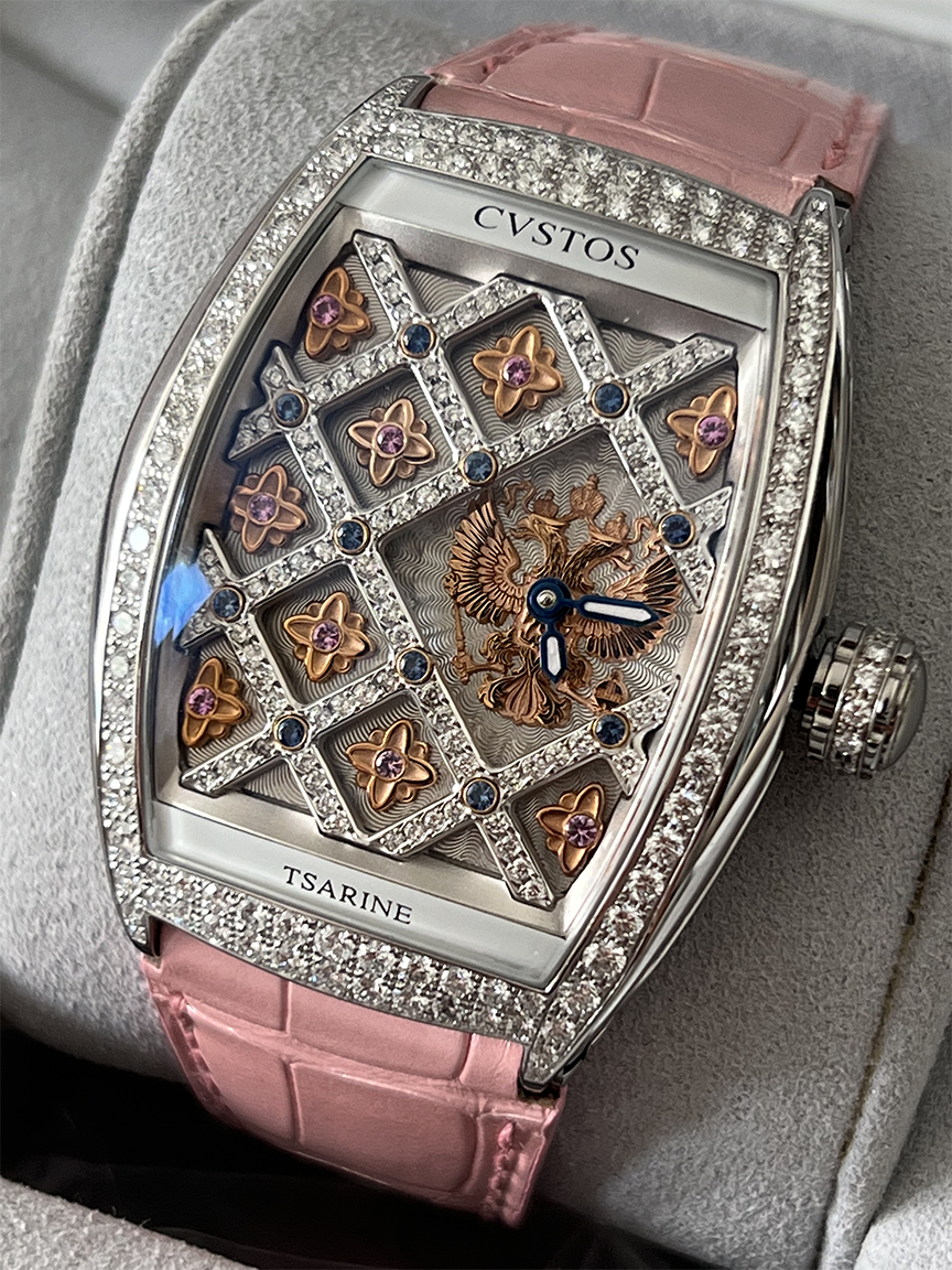 Компания CVSTOS представляя новую коллекцию TSARINE в 2017 году заявляла что при создании циферблата часов Diamonds Russian Coat of Arms вдохновлялась лучшими работами Дома Фаберже, что как нельзя лучше соответствует "царскому" названию коллекции.