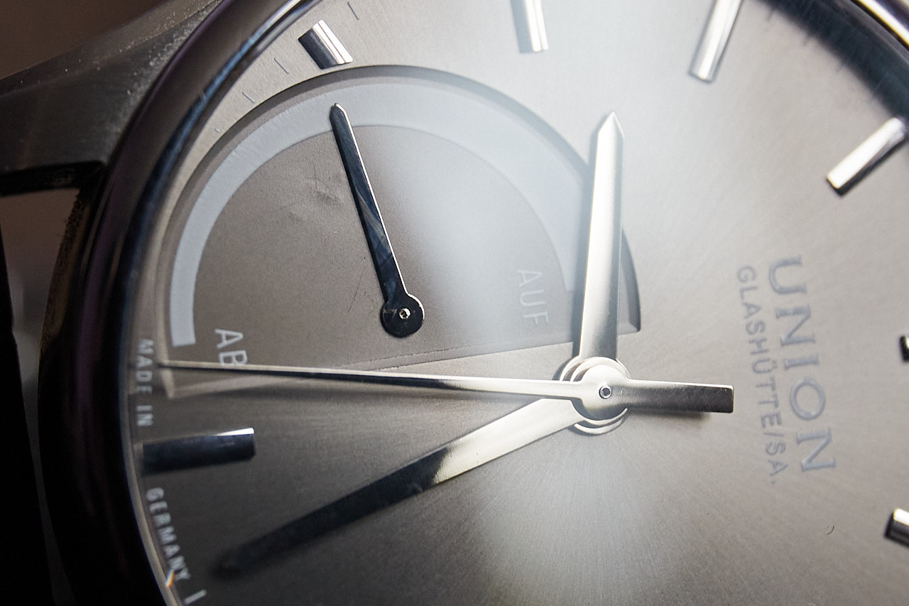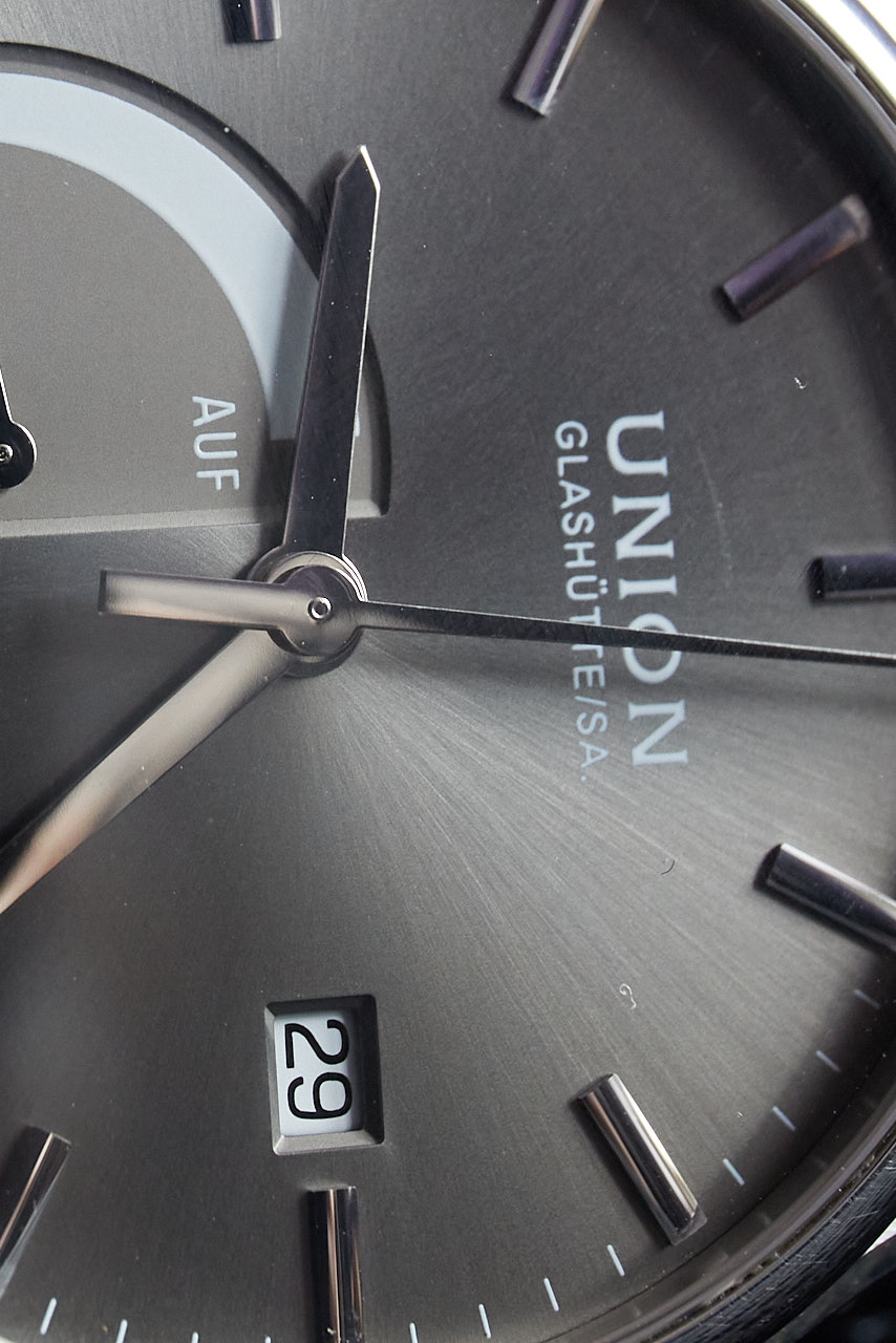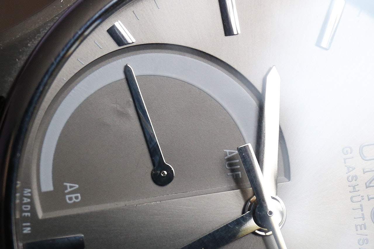 Вкратце: появилась пыль внутри, появились царапины на стрелке запаса хода, как будто ее зубами медведя снимали, появились дефекты на циферблате в вокруг стрелки запаса хода, как будто на нем гномы в каблуках танцевали. Потом при макросъемке, я рассмотрел еще больше дефектов.