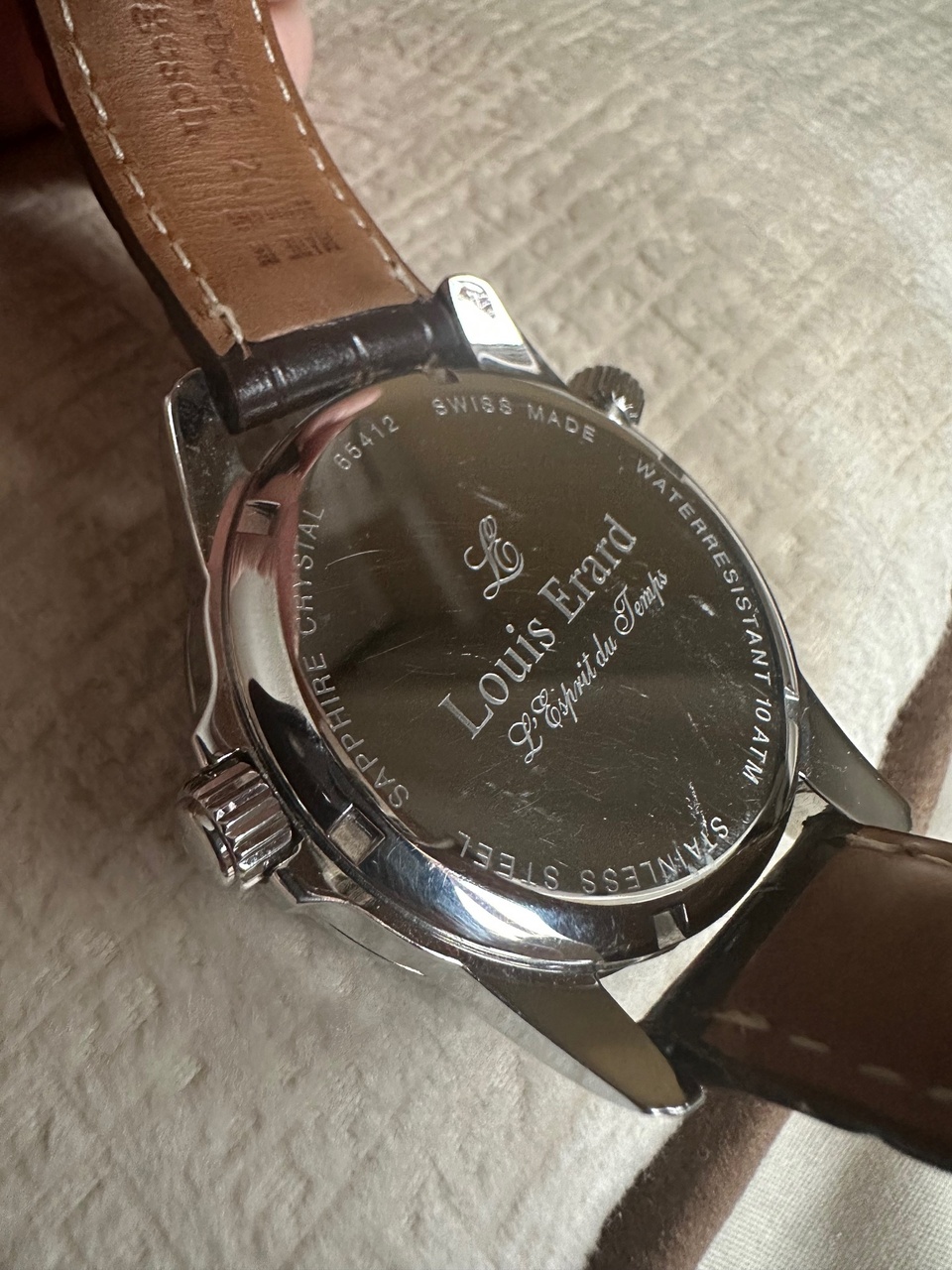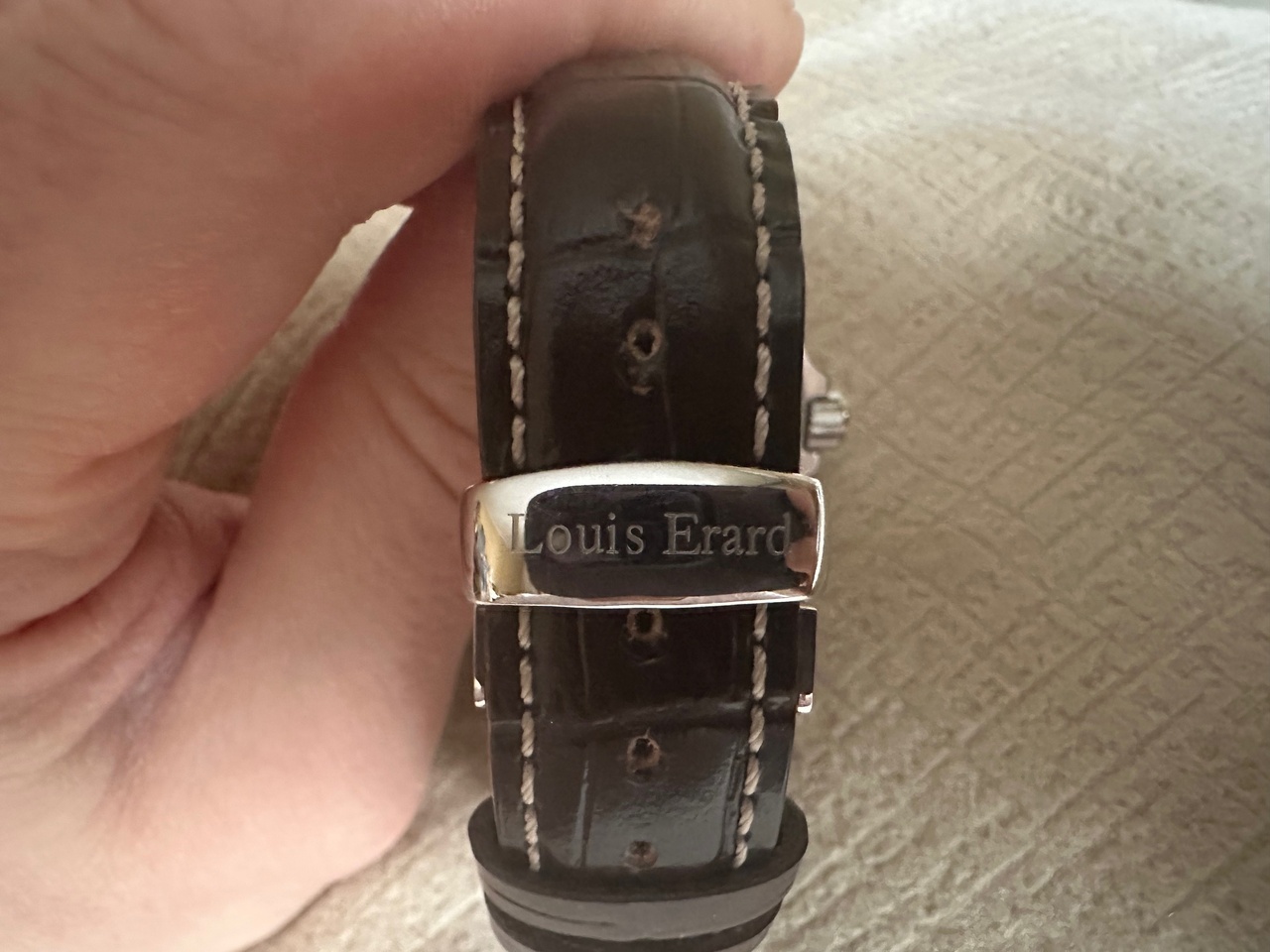 Продам свои часы Louis Erard Sportive с датой и удобной функцией GMT. Шрифт чем-то романы Жюля Верна напоминает. Состояние нормальное, полировать не стал. Ремешок не родной, но в очень приличном состоянии, застежка родная. В ремонте не были, ход вполне приличный. На каждый день - неплохой вариант.