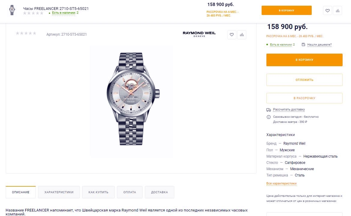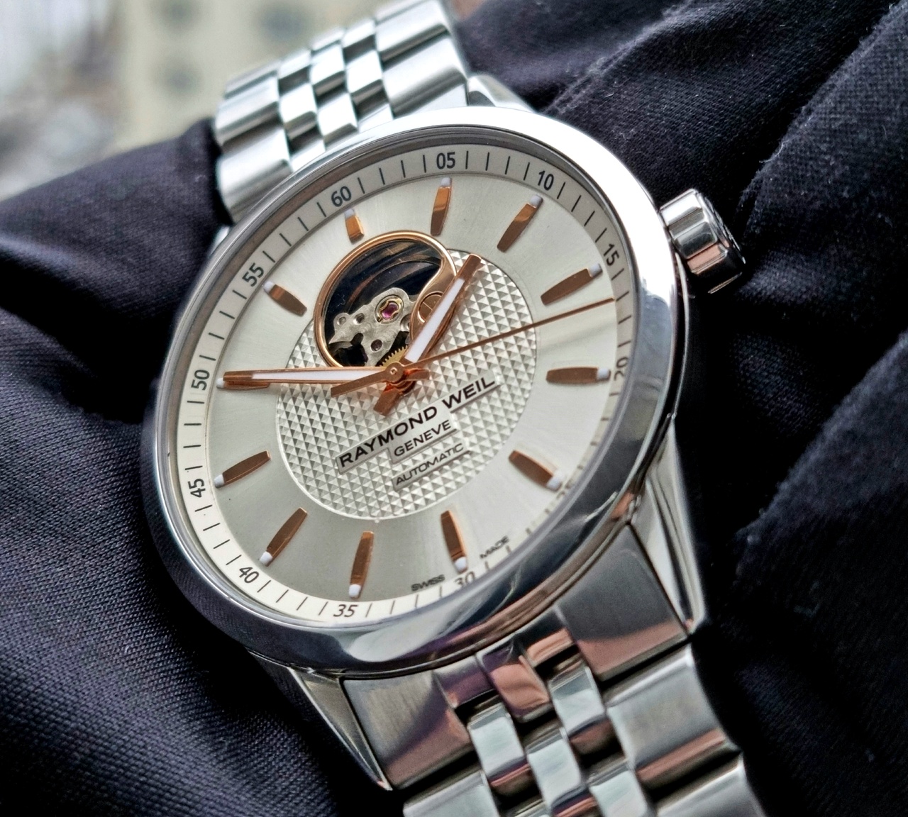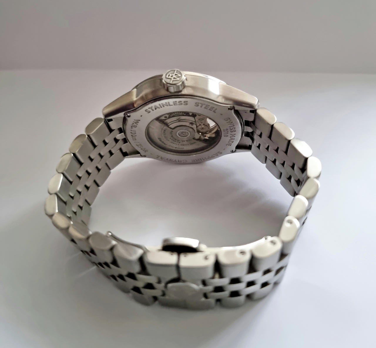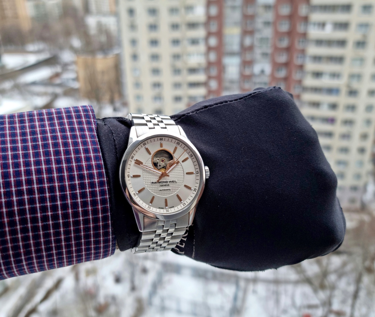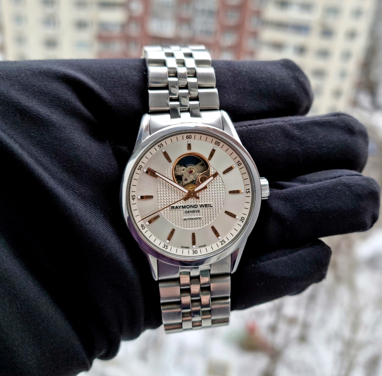 В продаже красивые мужские часы швейцарской компании Raymond Weil с открытым балансом хода. Часы в отличном состоянии, браслет отрегулирован на мою руку 18,5см в обхвате, доп. звеньев нет, только часы в комплекте, механизм обслужен в марте 2024г.