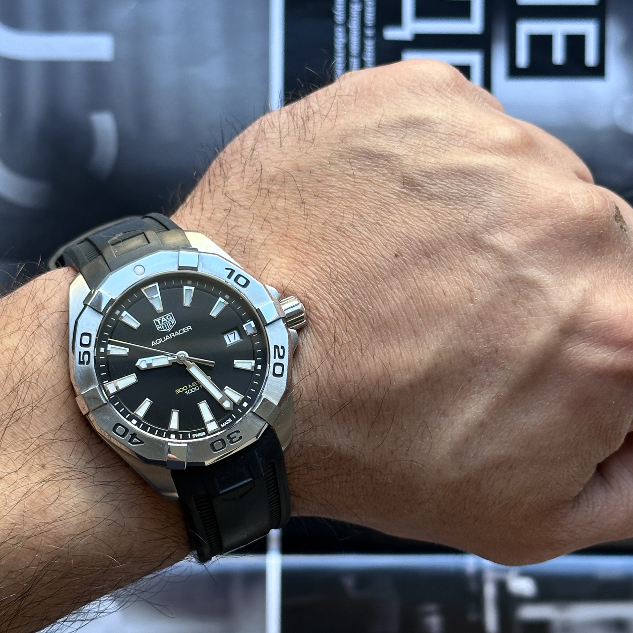 Культовый дайвер от Tag Heuer из коллекции Aquaracer. Надежный и не требующий дорогостоящего обслуживания кварцевый калибр. Эргономичный размер, гармонично смотрящийся практически на любом запястье. Отличный люм как и подобает породистым дайверам. Куплены 06.12.2021г в бутике Tag Heuer в ТЦ Европейский в Москве. Полнейший комплект включая чек о покупке. Не путайте со старыми версиями, где Ref начинается с WАY.