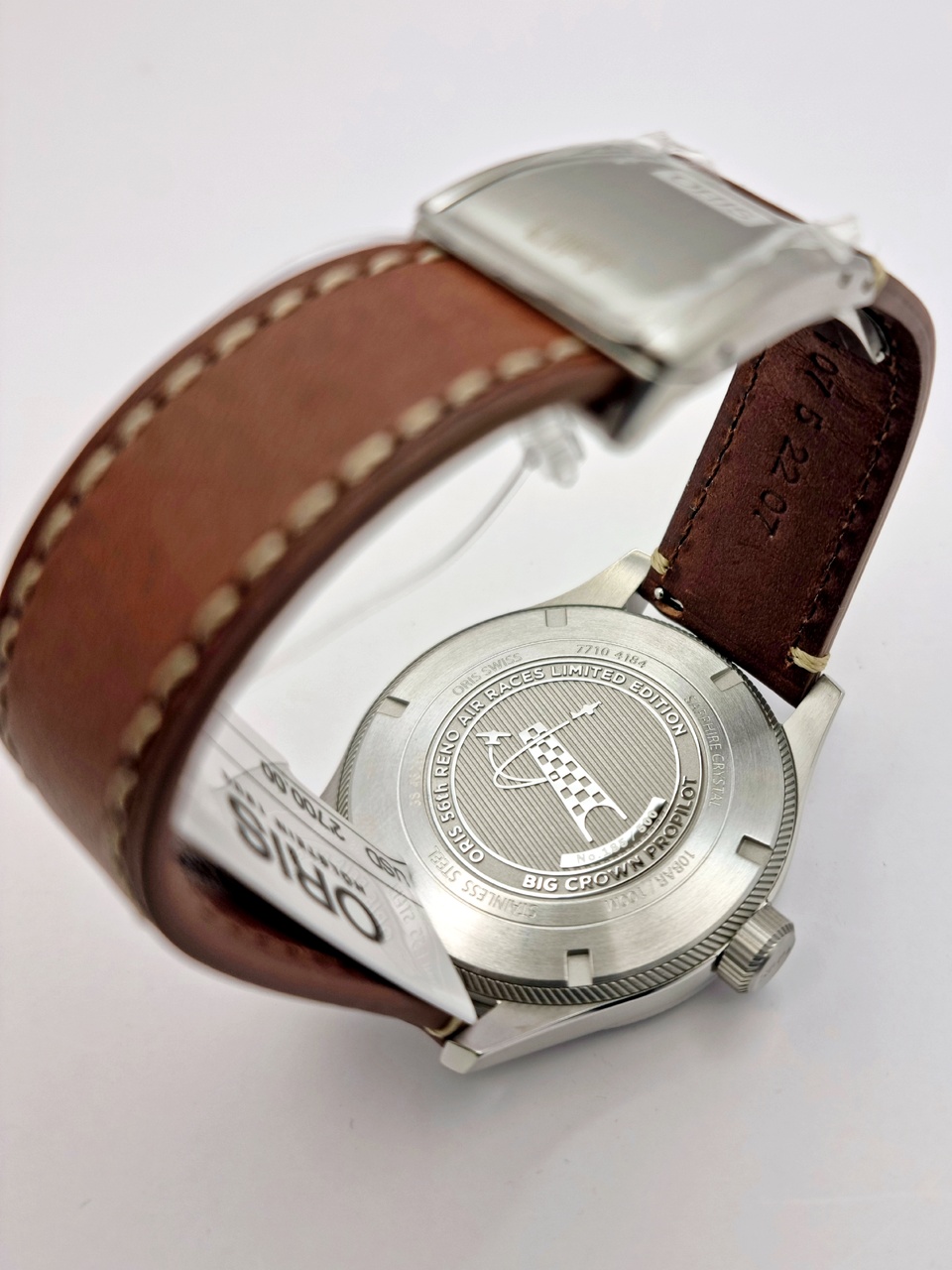 В продаже очень красивые мужские часы Oris Big Crown Pro Pilot 56th Reno Air Races Limited Edition. Лимитированная серия - всего 500 экземпляров, выпущена в честь 56-го Национального чемпионата по авиационным гонкам, легендарного события, проводимого в Рино, Невада. Многокомпонентный круглый корпус из стали с рифлеными краями. Второй часовой пояс в 24-х часовом формате времени, отображается центральной стрелкой, которая раскрашена в белый и красный цвета, чтобы напоминать флаги и пилоны чемпионата. Секундная стрелка вынесена на отдельный циферблат.