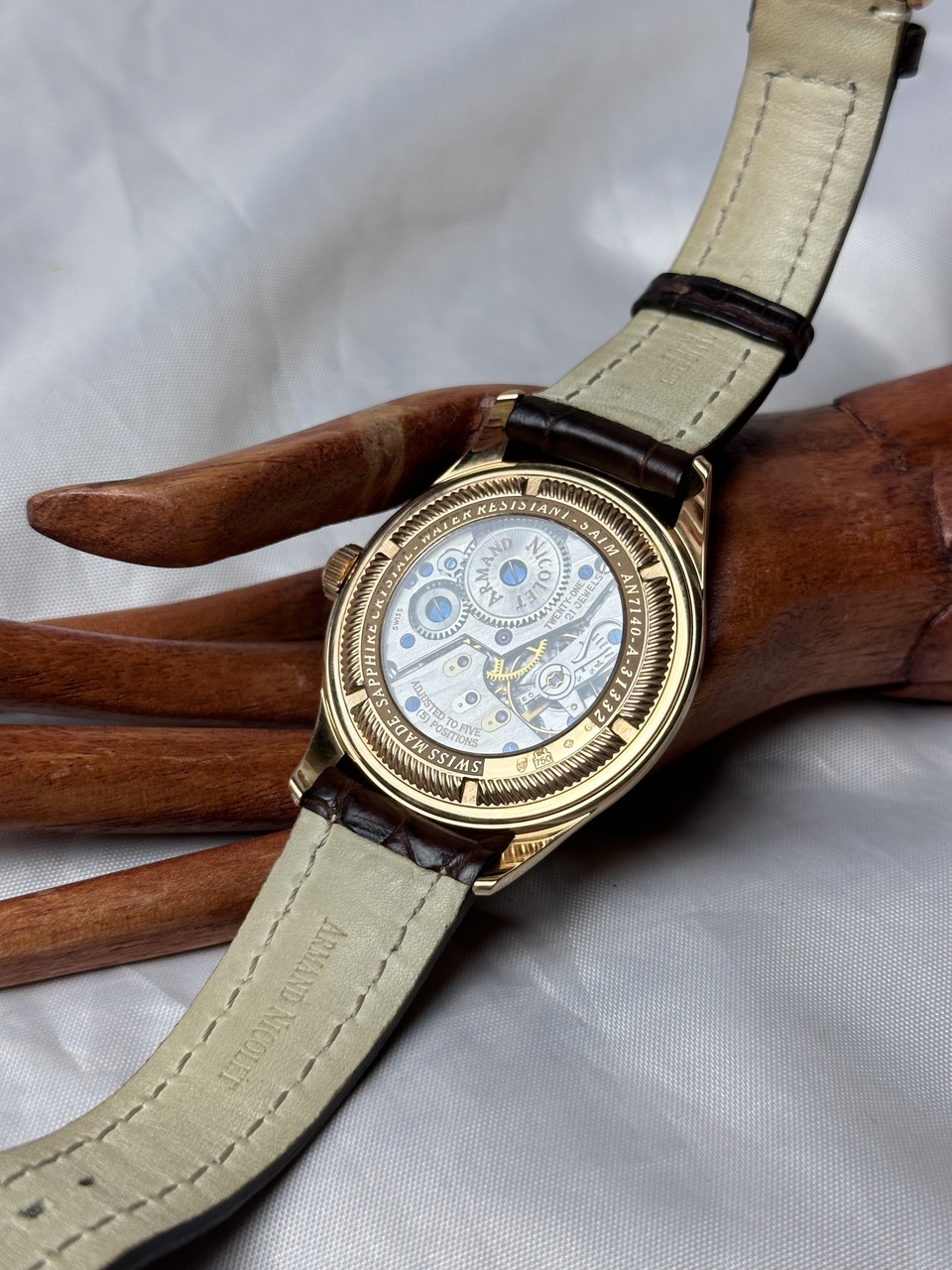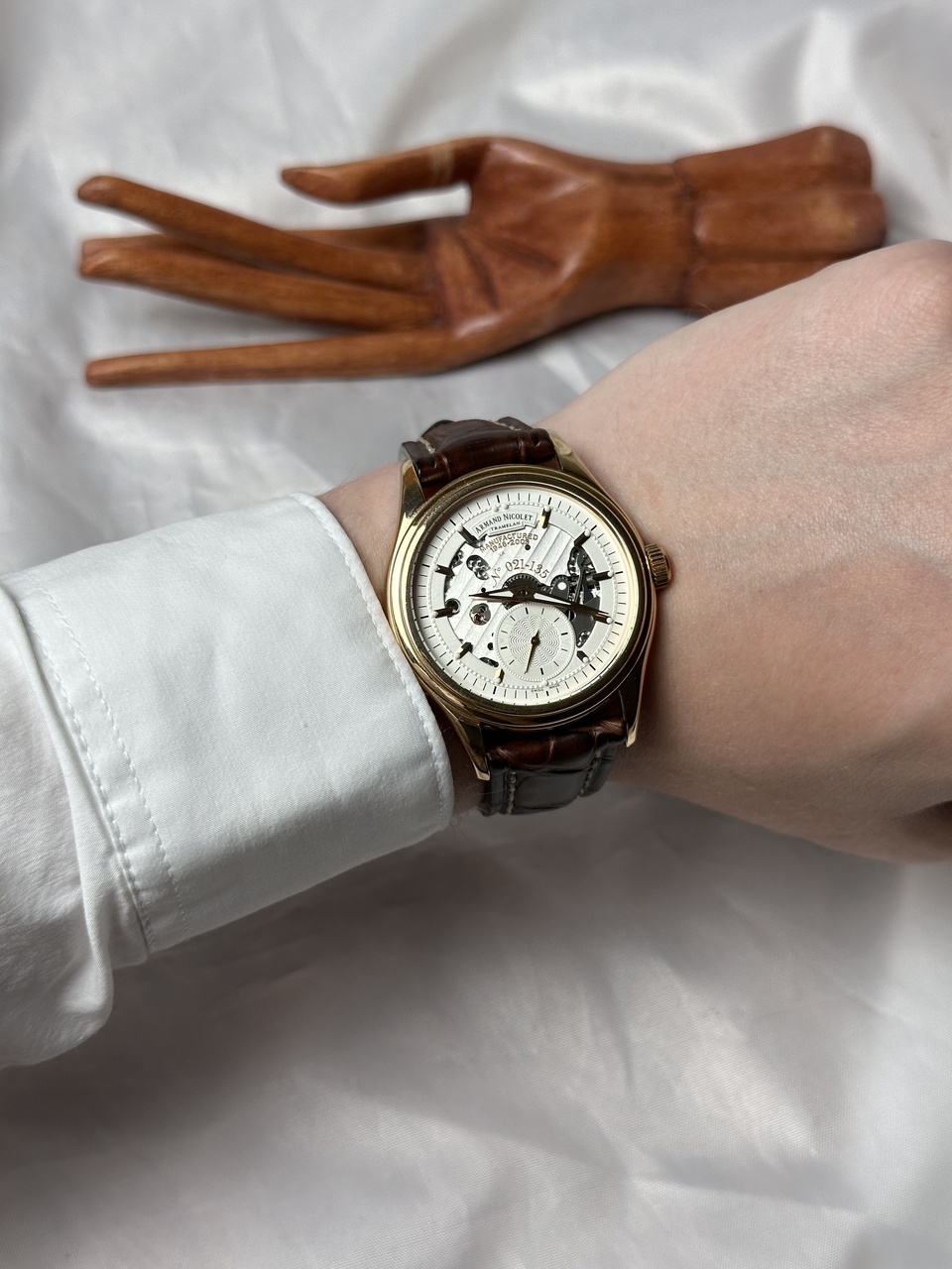 Полускелетизированный кремовый циферблат с позолоченными метками, которые светятся как звезды в ночном небе. Эти метки не просто указывают время, они создают атмосферу, в которой каждое мгновение становится особенным.