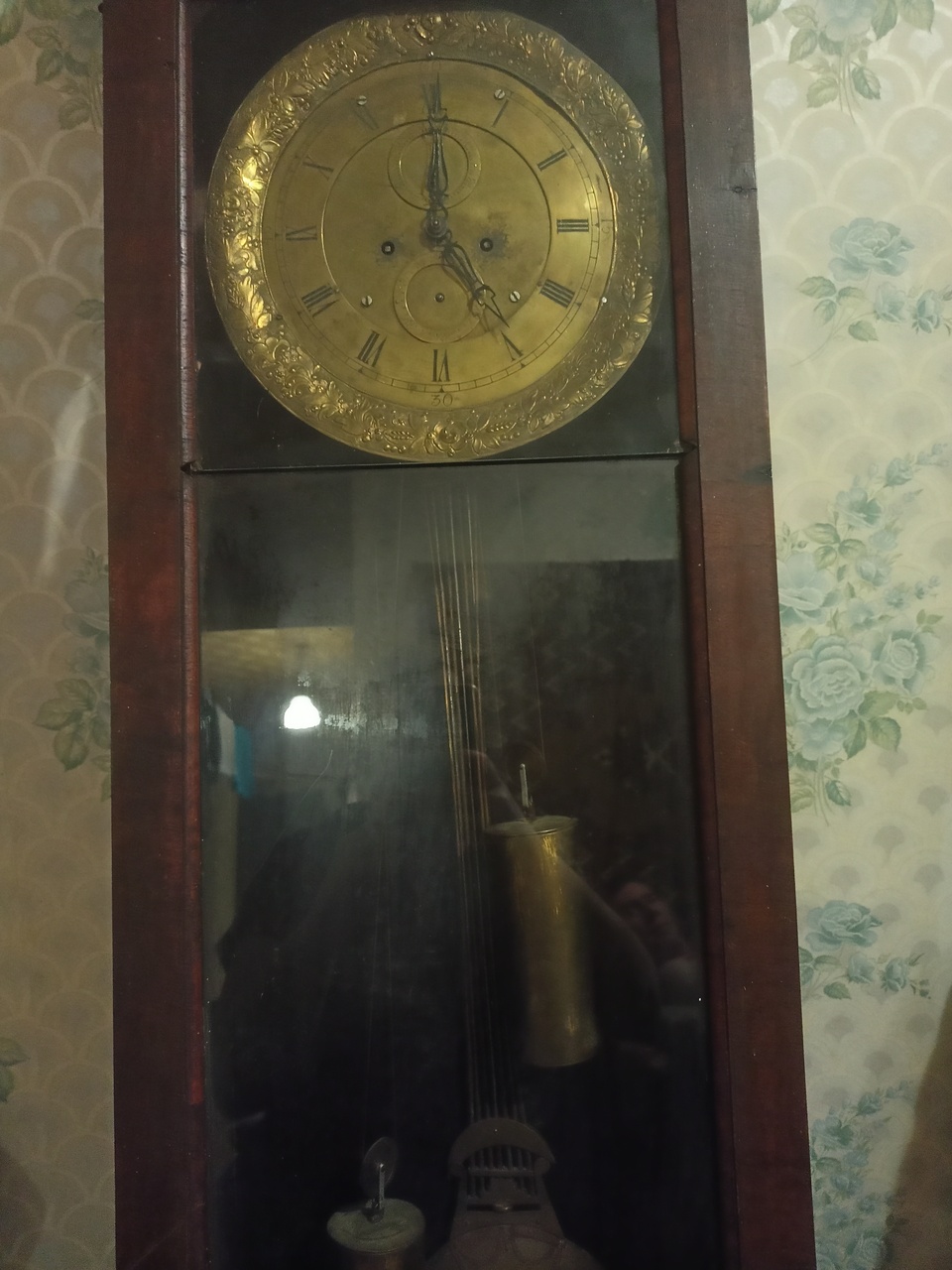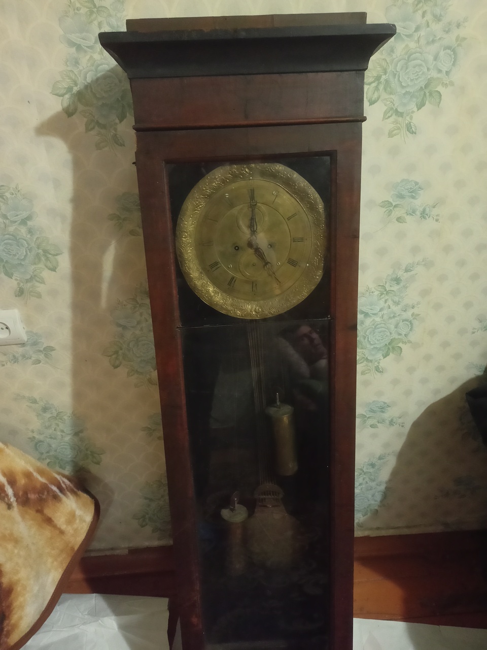 Это хорошие настенные часы русского кустарного производства, 1840-е годы. Пожалуйста, сделайте фото механизма со вспышкой и маятника для более точного определения, возможно, нам удастся вычислить и мастера, который их изготовил. Механизм закреплен на деревянной полочке, которая вытаскивается из корпуса в своих направляющих. Попросите помощника придержать дверь открытой и потяните за деревянную полочку на себя (не за циферблат!). Сфотографируйте механизм со всех сторон, обязательно включив фонарик или вспышку на телефоне.
