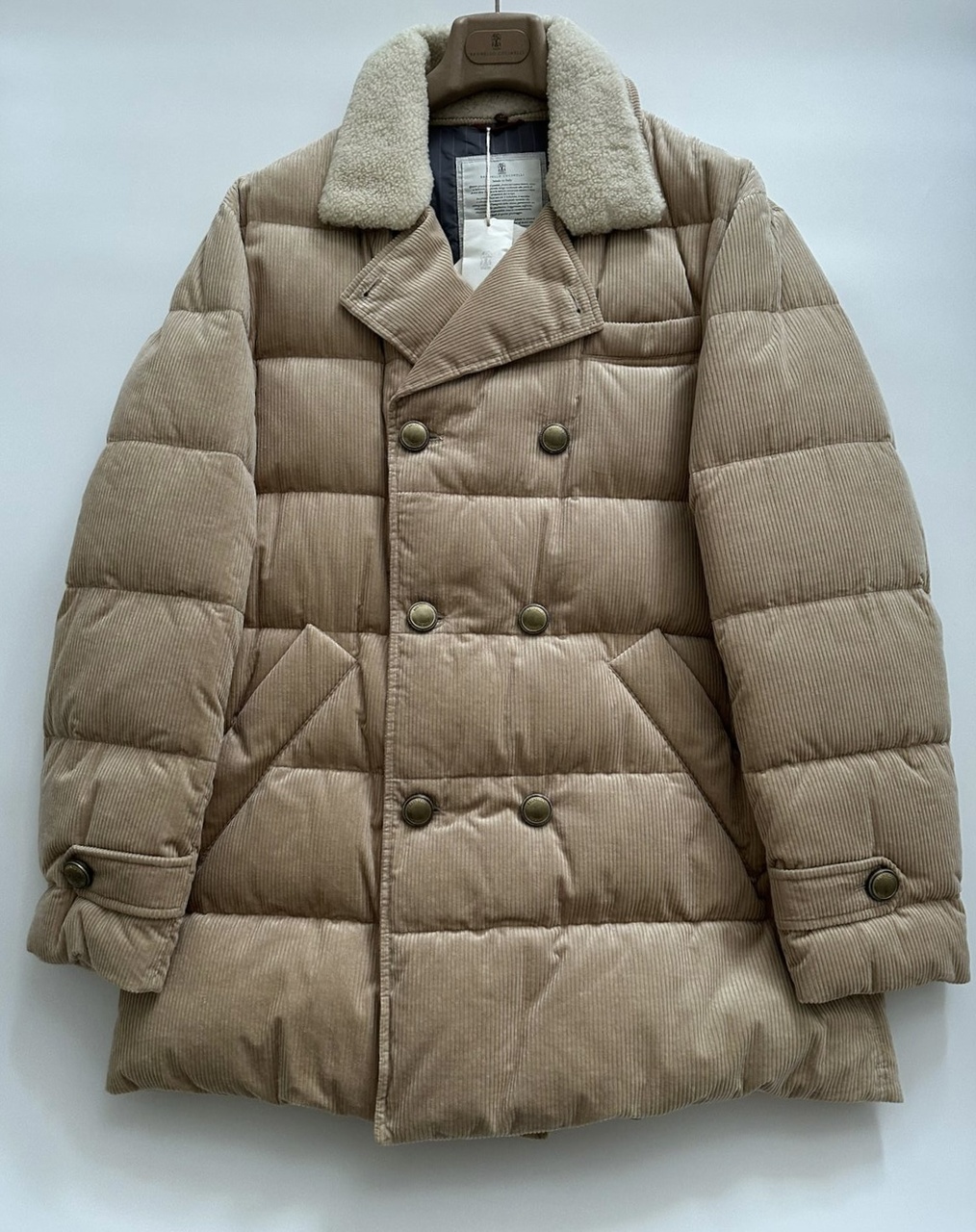 Бархатистая текстура вельвета подчёркивает сезонные оттенки и усиливает мягкость данного изделия.Вельвет из чистого хлопка-это классическая ткань зимнего сезона.Её легко узнаваемая текстура идеально подходит для создания модели в стиле двубортного пуховика.Куртка выполнена в светло-бежевом цвете,имеет застёжку спереди на металлические пуговицы,которые также придают элегантность внешнему виду:ручная отделка обеспечивает особенный «поношенный» эффект,что подчёркивает неоднородность их поверхности и делает каждый отдельный аксессуар уникальным.На отложном воротнике мягкая и воздушная текстура овчины украшает съёмную вставку:маленькие пуговицы,пришитые по краю воротника,позволяют легко отстегнуть аксессуар.Два прорезных кармана по бокам на кнопках,внутренние карманы на молнии и на пуговице,карман для ручки.Изделие утеплено слоем воздушного гусиного пуха,делая модель идеальным спутником в морозную погоду.Все виды пуха приобретены у поставщиков-членов европейской организации EDFA,которая гарантирует бережное отношение к окружающей среде и животным.Внутренняя отделка из водонепроницаемого нейлона обеспечивает комфорт.