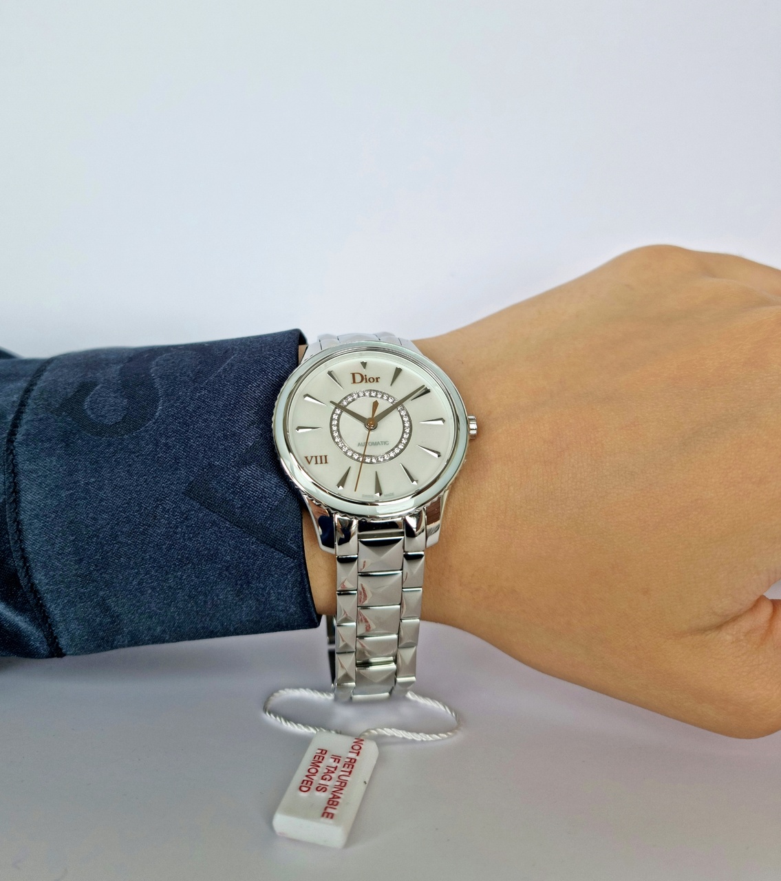 Корпус этих шикарных часов в размере 36мм выполнен из нержавеющей стали. Циферблат из перламутра украшен бриллиантами. Фирменный браслет пирамидка шикарно переливается на свету. Водозащита 50м(5атм). Швейцарский автоматический механизм с автоподзаводом. Запас хода до 42 часов. Устойчивое к царапинам сапфировое стекло.