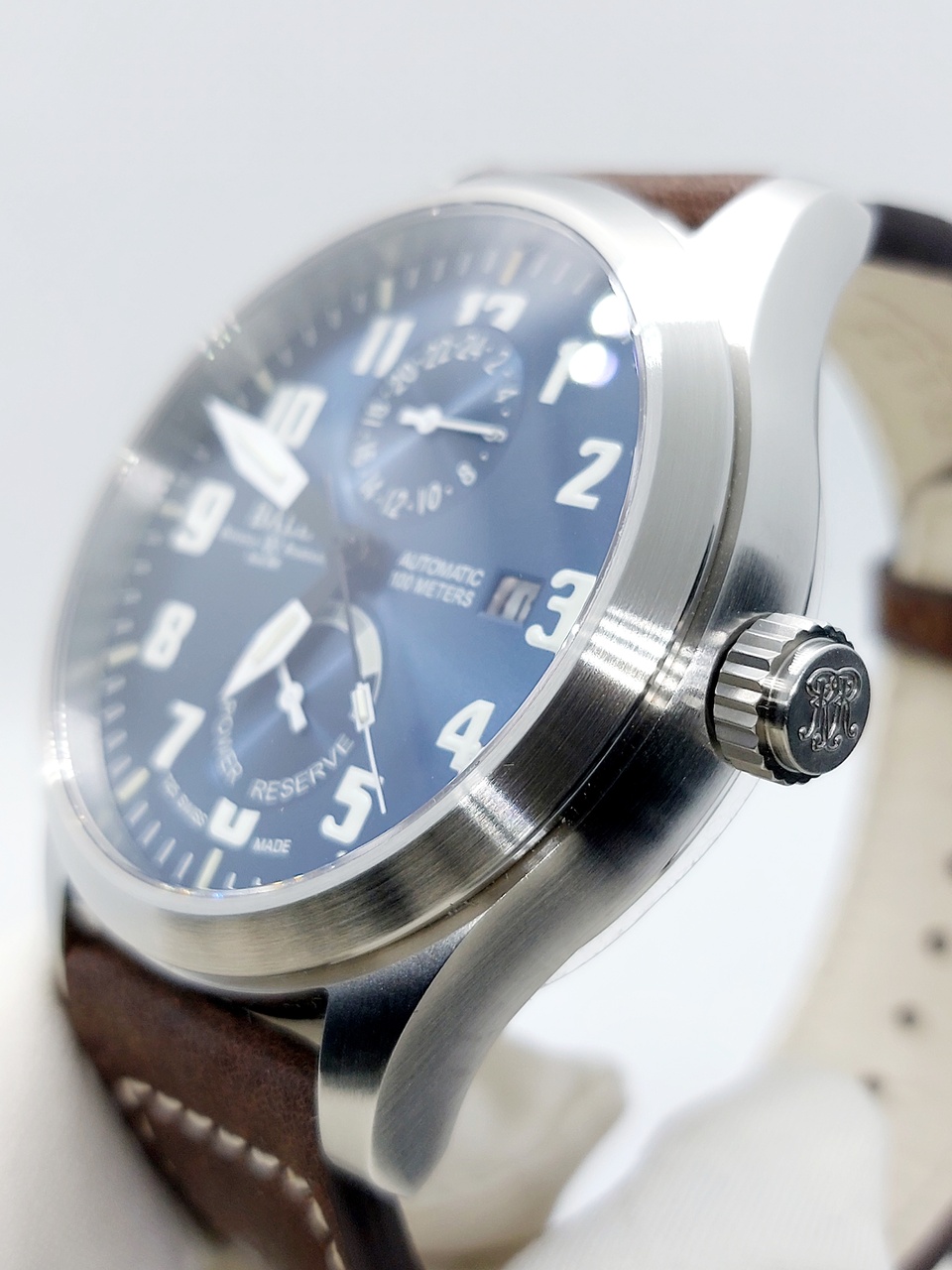 Циферблат синего цвета с эффектом Sunray имеет несколько уровней, а так же два дополнительных циферблата показывающие 24-х часовой формат(GMT) и индикатор запаса хода.