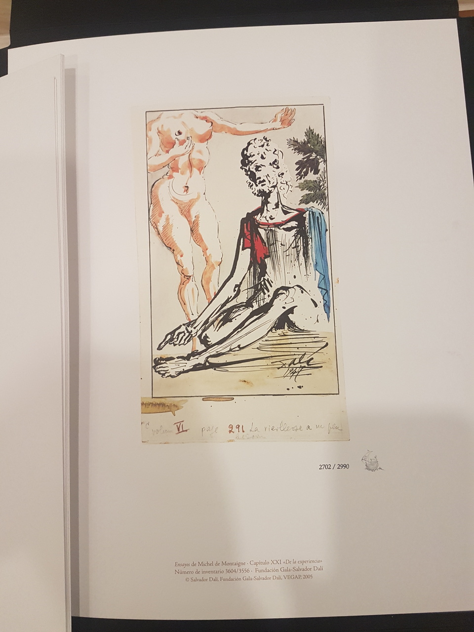 Уникальная и неповторимая работа, выпущенная ограниченным тиражом до 3000 экземпляров. Пронумерованы, согласно нотариальному акту, от I до X, первая десятка, и от 1 до 2990, следующие. Книга содержит 21 очерк Мишеля де Монтень, выбранный Сальвадором Дали и проиллюстрированный между 1946 и 1948 годами.