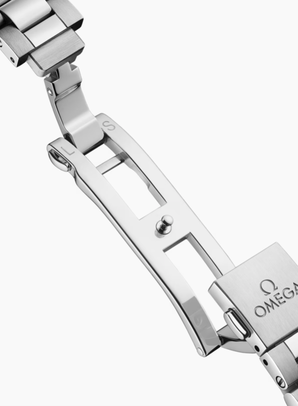 Браслетная застежка “бабочка”, раскладывающаяся при нажатии на кнопки двойной системы блокировки, с гравированной эмблемой Omega