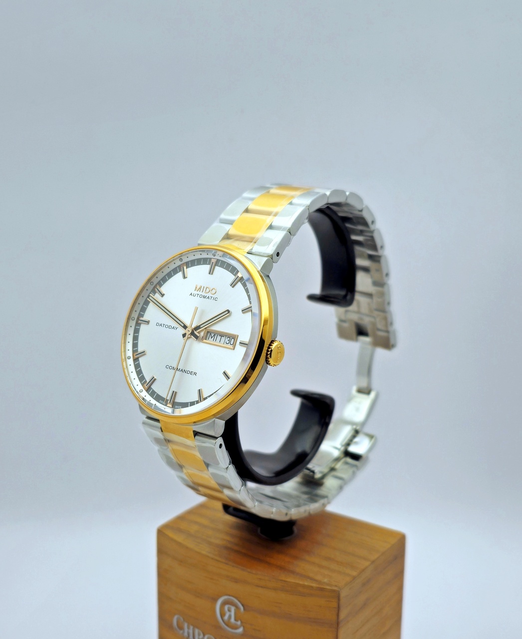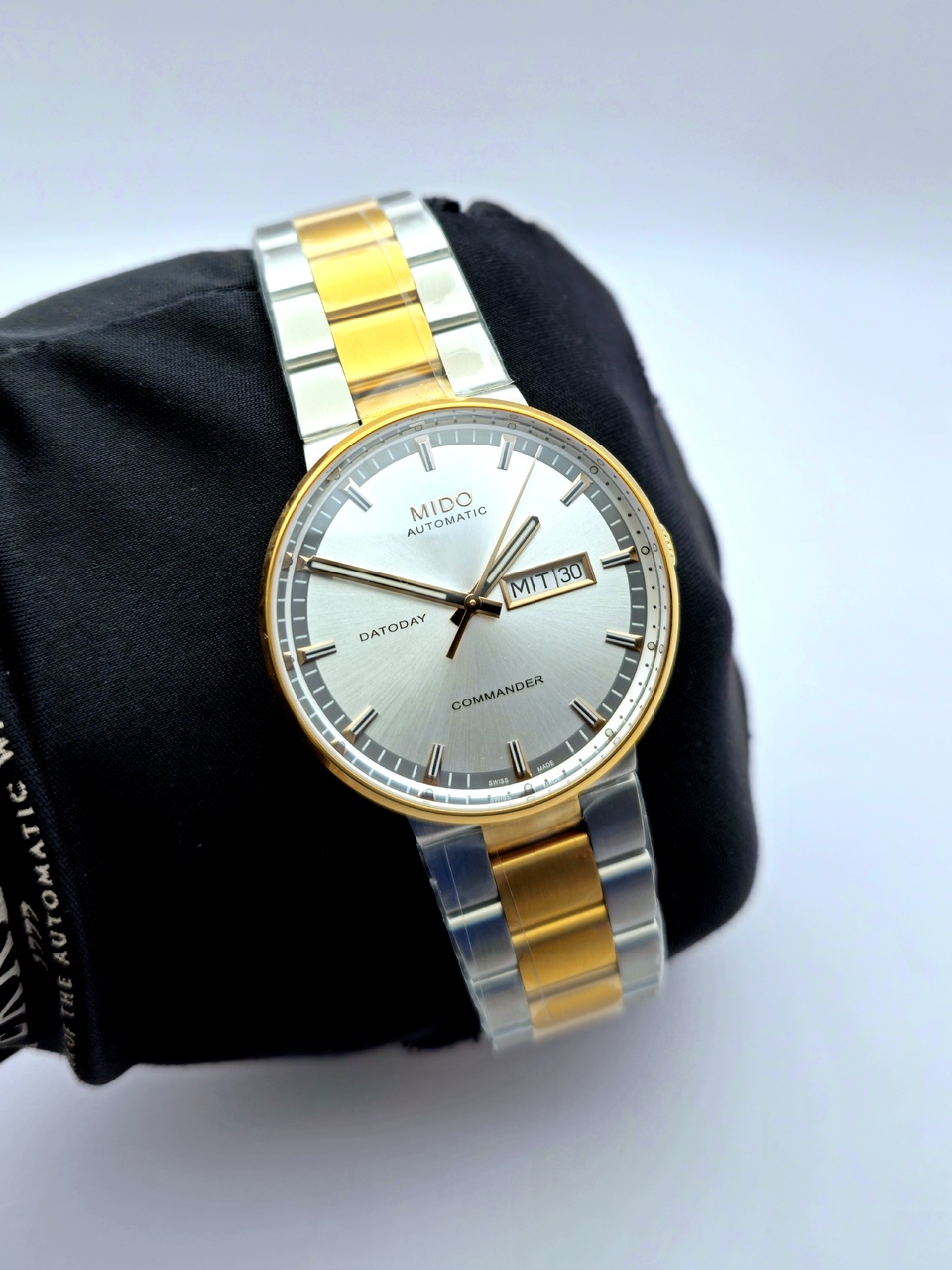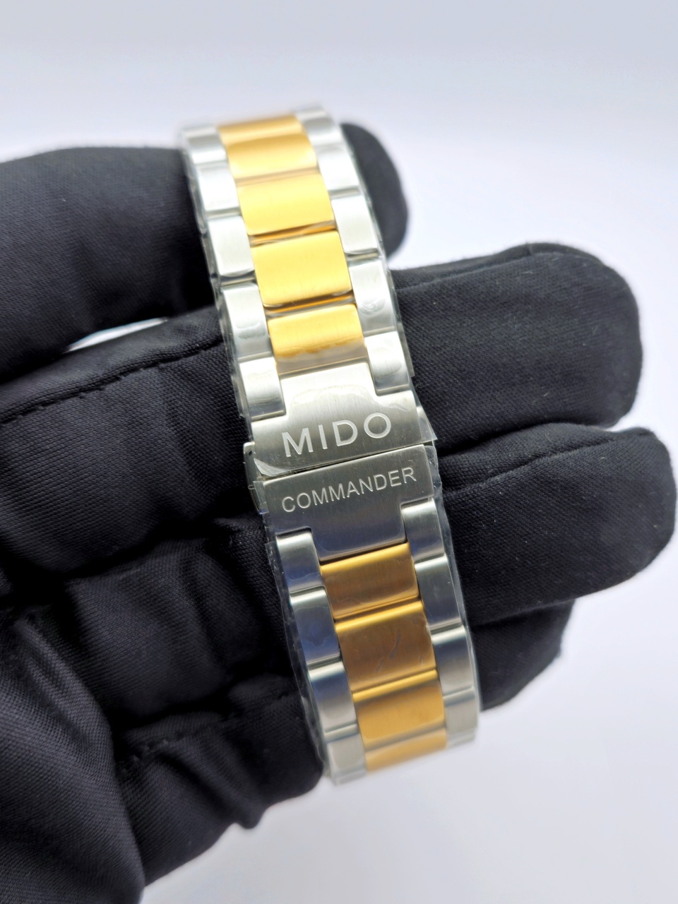 В продаже стильные мужские швейцарские часы Mido Commander в которых установлен автоматический механизм (Mido Caliber 80 (базовый ETA C07.621) с высокой точностью и с запасом хода до 80ти часов. Сапфировое стекло устойчивое к появлению царапин, обладающее высокой прозрачностью. Класс водозащиты: 50 метров, позволит защитить корпус от случайных брызг или капель дождя. Корпус часов в размере 40мм изготовлен из стали серебристого цвета с жёлтым PVD покрытием. Скромность, граничащая с вызовом современности. Данная модель станет верным спутником на Вашем запястье.