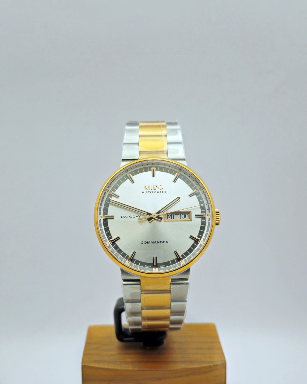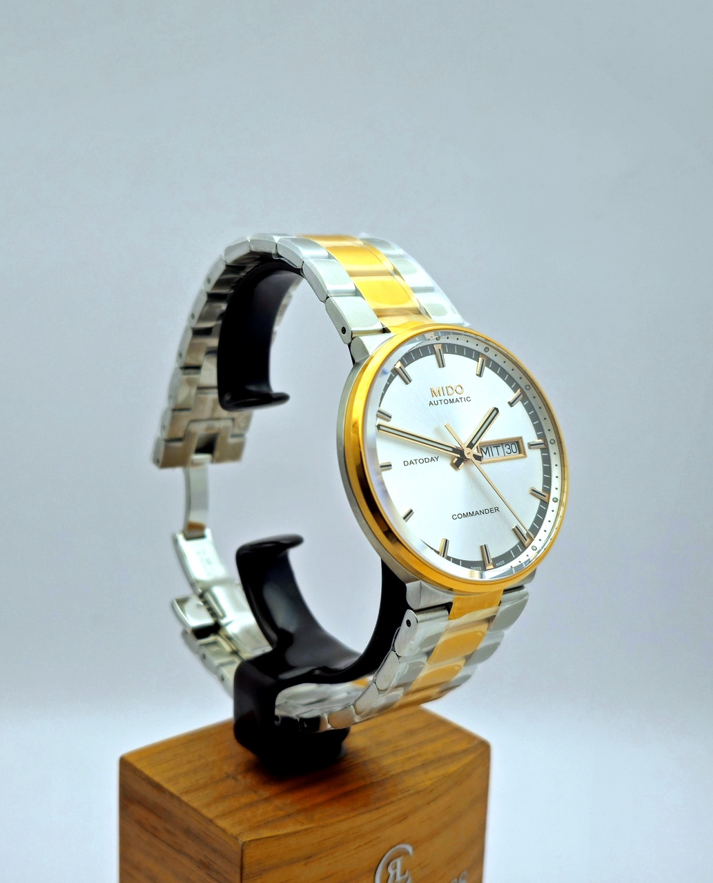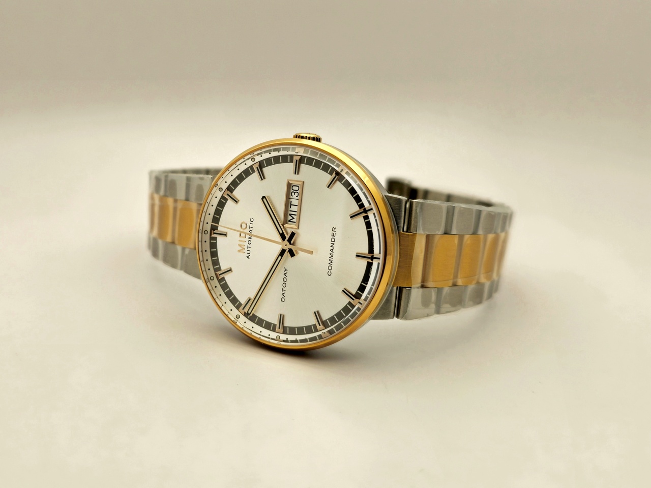 В продаже стильные мужские швейцарские часы Mido Commander в которых установлен автоматический механизм (Mido Caliber 80 (базовый ETA C07.621) с высокой точностью и с запасом хода до 80ти часов. Сапфировое стекло устойчивое к появлению царапин, обладающее высокой прозрачностью. Класс водозащиты: 50 метров, позволит защитить корпус от случайных брызг или капель дождя. Корпус часов в размере 40мм изготовлен из стали серебристого цвета с жёлтым PVD покрытием. Скромность, граничащая с вызовом современности. Данная модель станет верным спутником на Вашем запястье.