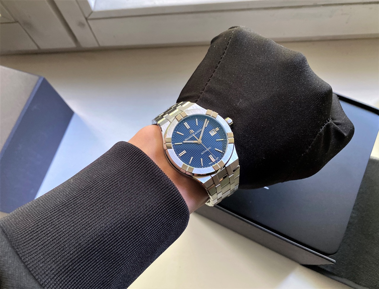 Прекрасный, синий, рельефный циферблат, очень красивый браслет, механика с автоподзаводом, водозащита 200 метров, диаметр 42мм.