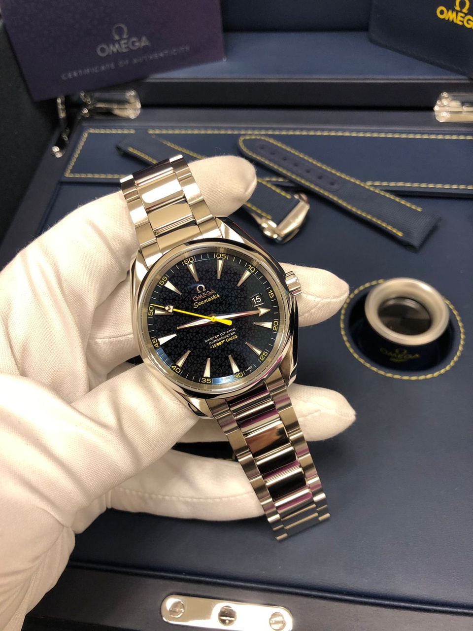 Не поскупилась Оmеgа и на комплектацию этой серии Sеаmаstеr Аquа Теrrа, огромная коробка в которой нашлось место документам, включая паспорт каждого номера лимитки; лупа с в фамильных цветах Бонда; запасной ремешок и инструмент для его установки