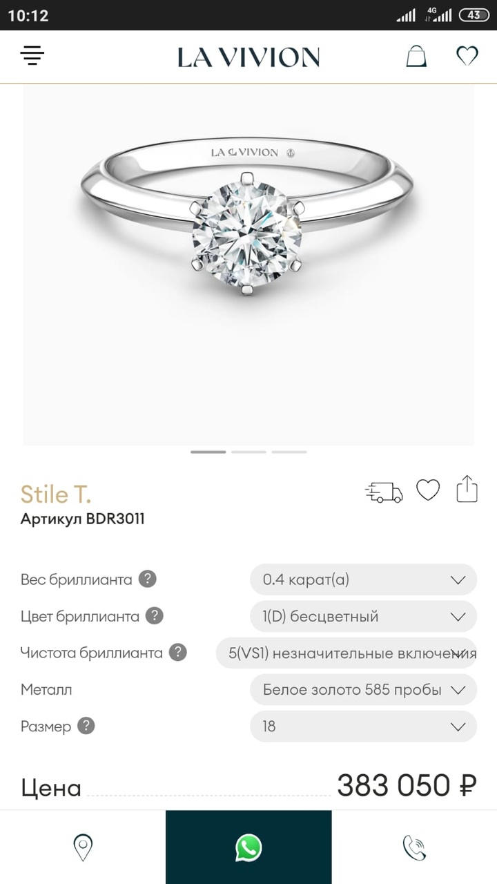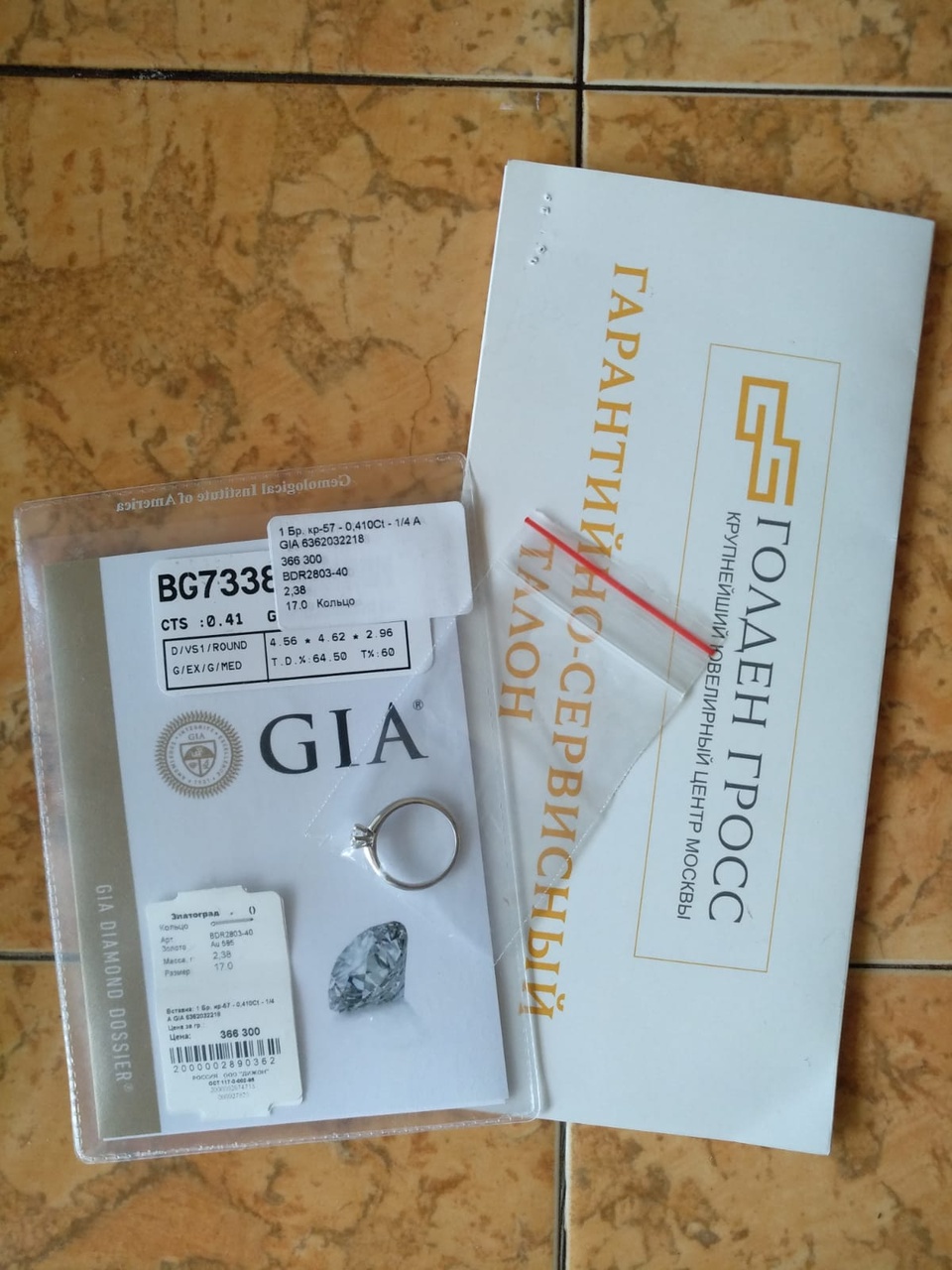 Кольцо La vivion с бриллиантом 0,41 D/VS1. Сертификат GIA.