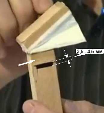 3. Звук регулируется смещением планки со скосом так, чтобы размер от ее острия до щели был в указанных на фото пределах. Планка со скосом окончательно приклеивается после регулировки. Резонатор должен быть герметичным по всем боковым и нижним швам.