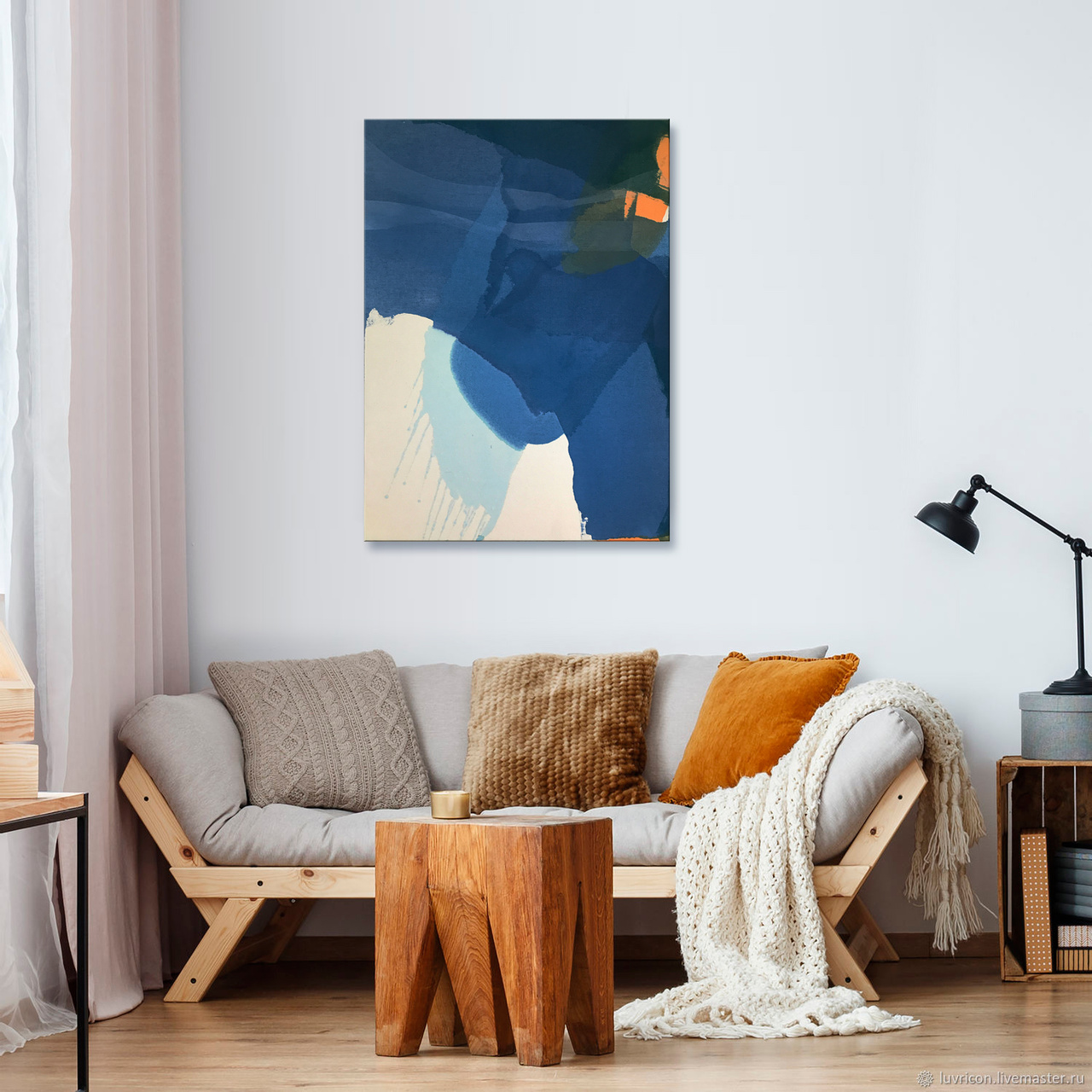 Цветовая композиция строится на глубоких оттенках синего, контрастирующих с белыми и бледно-голубыми участками, а точечные оранжевые акценты придают работе внутреннее напряжение и выразительность. Синие формы словно плывут в пространстве холста, создавая ощущение движения и глубины.