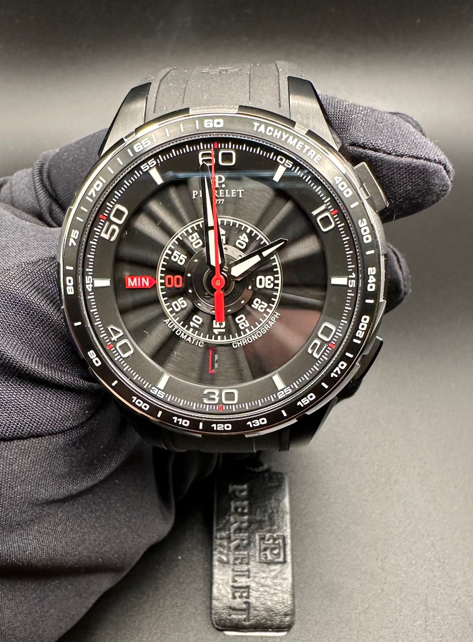 Модель оснащена швейцарским автоматическим механизмом Perrelet P-361, с двойным ротором, функциями индикации часов, минут, даты, а также с функцией хронографа (центральная секундная стрелка красного цвета и 60-минутный счетчик, выполненный в виде двух, наложенных друг на друга, центральных круглых градуированных сапфировых стекол с красным указателем, расположенным на 9 часах). Поставляется на черном каучуковом ремешке.
