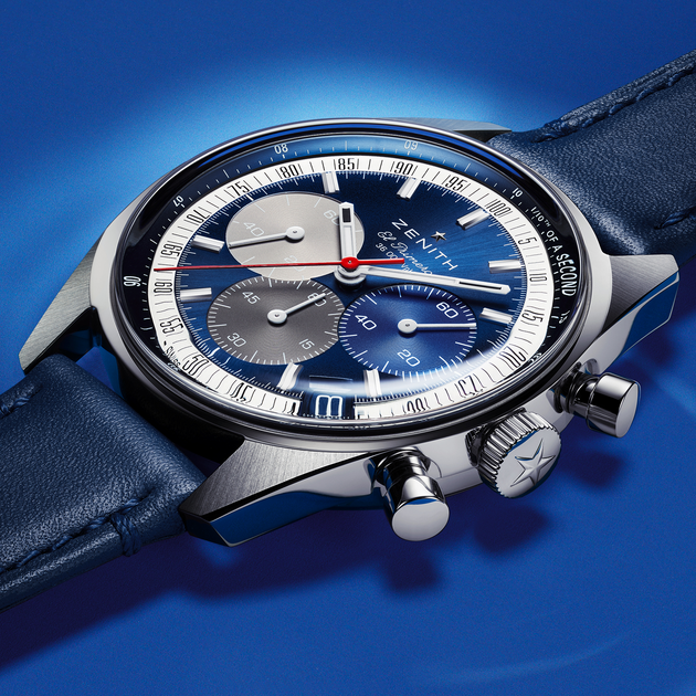 оттенке бренда. Новая версия этих неизменно актуальных часов предлагает свежий взгляд на классический дизайн, а элегантное и современное оформление подтверждает их знаковый статус в мире точного часового мастерства. На темно-синем фоне легко узнаваемые накладывающиеся друг на друга счетчики первого в истории ZENITH El Primero Ref. A386 выполнены в цветовой палитре оригинального циферблата – сером, темно-сером и синем оттенках. Эффектная кольцевая шкала с шагом в 1/10 секунды выдержана в контрастном серебристом цвете и обеспечивает оптимальную читаемость показаний. Тщательно продуманную композицию дополняют накладные часовые метки и стрелки в форме baton.