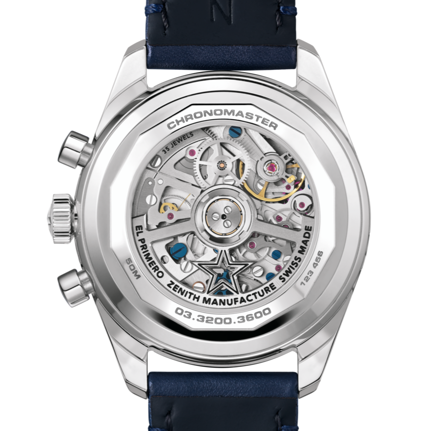 Исключительно четкое и удобное отображение показаний осуществляется с помощью центральной секундной стрелки хронографа, которая совершает полный оборот каждые 10 секунд вместо стандартных 60. Механизм также оснащен функцией остановки секундной стрелки и запасом хода, увеличенным до 60 часов. Сквозь сапфировое стекло задней крышки можно рассмотреть сложную архитектуру механизма, в том числе колонное колесо и ажурный ротор со знаменитой пятиконечной звездой ZENITH.
