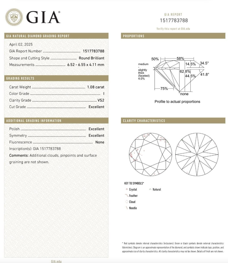 ВСТАВКА: 2 круглых бриллианта по 1.00 карат каждый; цвет I Чистота VS2 3 EX