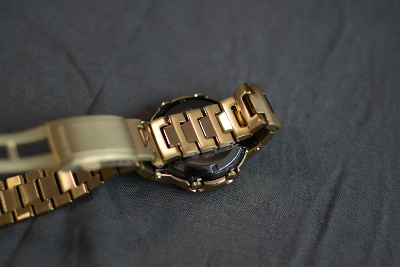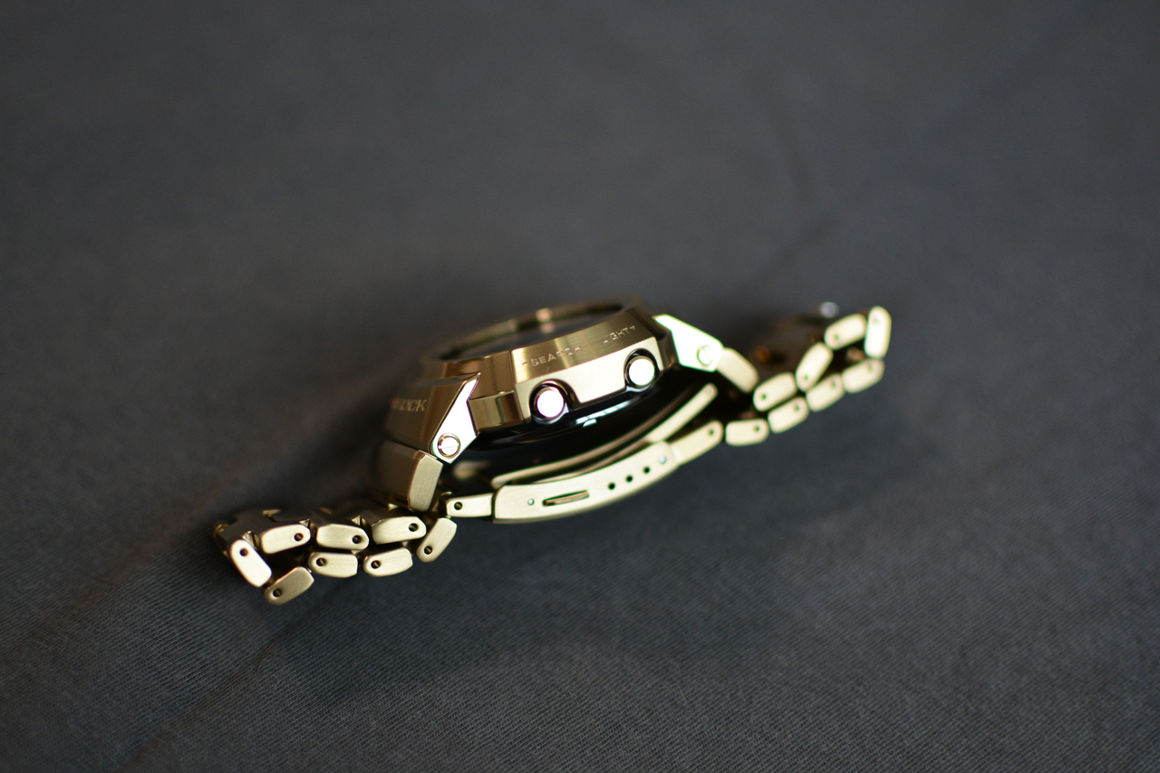Доброго времени суток, друзья! Наконец-то ко мне приехали мои первые G-Shock из Японии. Заказал их в первые дни после начала продаж, так как очень понравились ещё на этапе фотографий. Данная модель основана на первой комбинированной аналогово-цифровой модели AW-500 от G-SHOCK, выпущенной в 1989 году, они полностью металлические и изготовлены из нержавеющей стали. Задняя крышка завинчивающаяся с DLC покрытием (посмотрю как оно себя покажет). Часы изготовлены качественно, хорошая полировка и сатинирование, браслет литой и застёжка тоже. В часах установлено утопленое минеральное стекло и оно вряд ли поцарапается. Имеется двойная подсветка дисплея и циферблата, но она загорается не плавно как на GWM-B5000. На борту также имеется радиосинхронизация Multiband 6, солнечная зарядка и стандартных набор функций для G-Shock. На сайте Casio пишется, что можно поменять язык отображения дня недели на русский, но я так и не нашёл где его изменить и в инструкции про это ни слова. Немного волновался за посадку часов на руке, так как крайние звенья браслета неподвижны, но оказалось что зря, часы сидят удобно и неподвижные звенья даже не замечаю (рука 17.5). В первые дни привыкал к спокойному, плавному дизайну и размеру часов (51,8 x 44,5 x 14,2), особенно после моих GST W110. Поначалу не верится что это знаменитые противоударные часы: плавные линии, лаконичный циферблат, гордая надпись G-Shock не выделенная краской - идеальный вариант для тех кто хочет одновременно неубиваемые часы и устал от агрессивного дизайна, ступенек и выступов. Я не любитель цыганщины и блестящих погремушек, однако мой выбор пал на золотую версию, особенно после того как увидел в магазине золотые GWM-B5000 - выглядят красиво и совсем не дёшево. Это золотое IP покрытие, предыдущие мои джишоки с IP служат хорошо, покрытие царапается, но не критично. Немного огорчило наличие двух пылинкок на циферблате (практически незаметны), почему-то ожидал полное отсутствие пыли в часах японской сборки, в этом плане часы не отличаются от всех моих предыдущих стрелочных G-Shock.