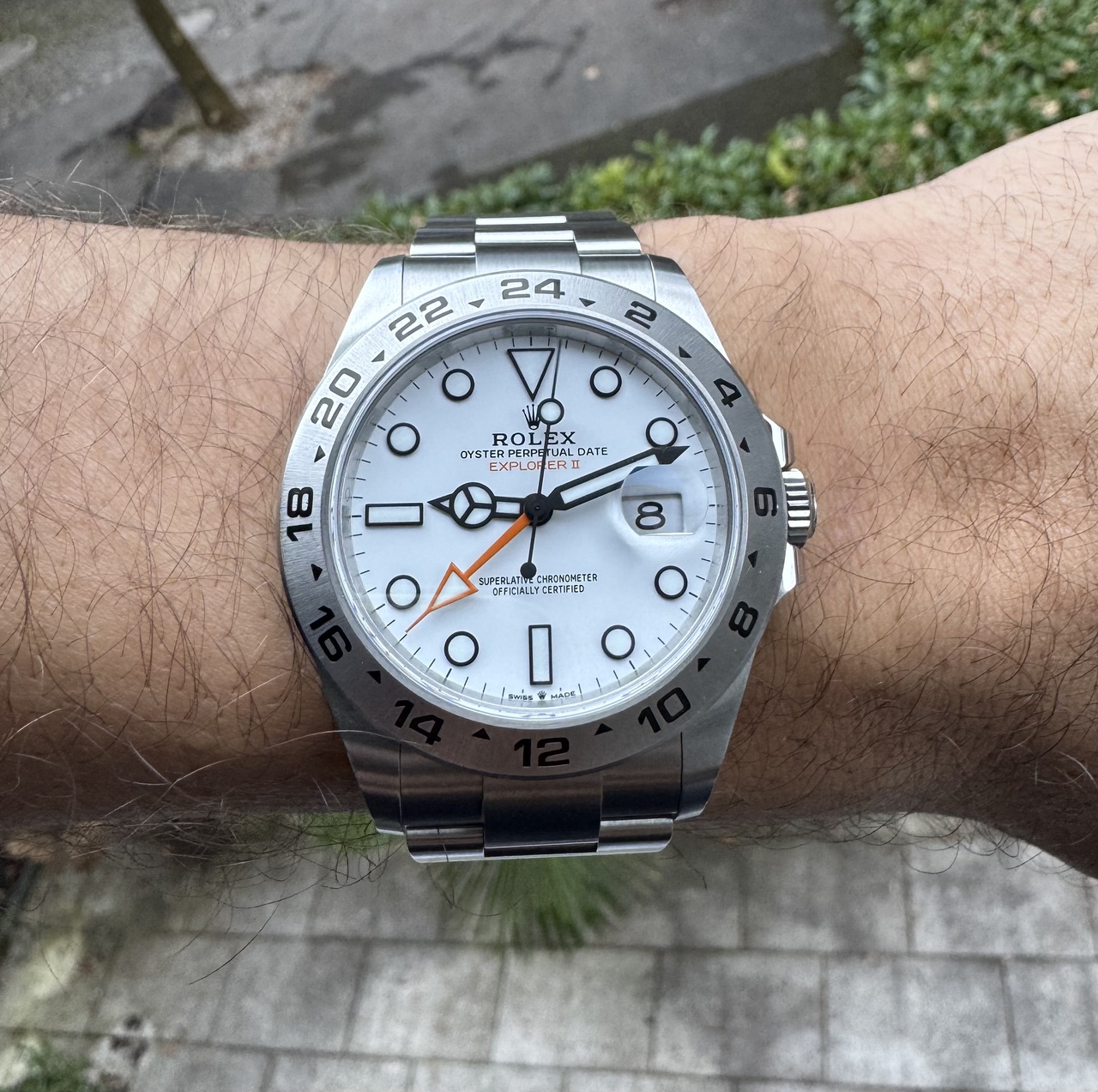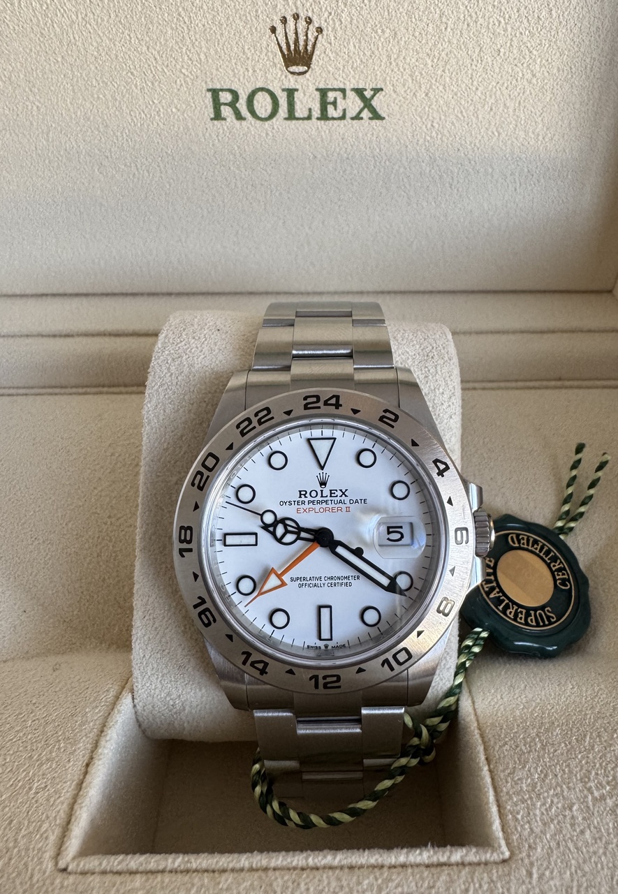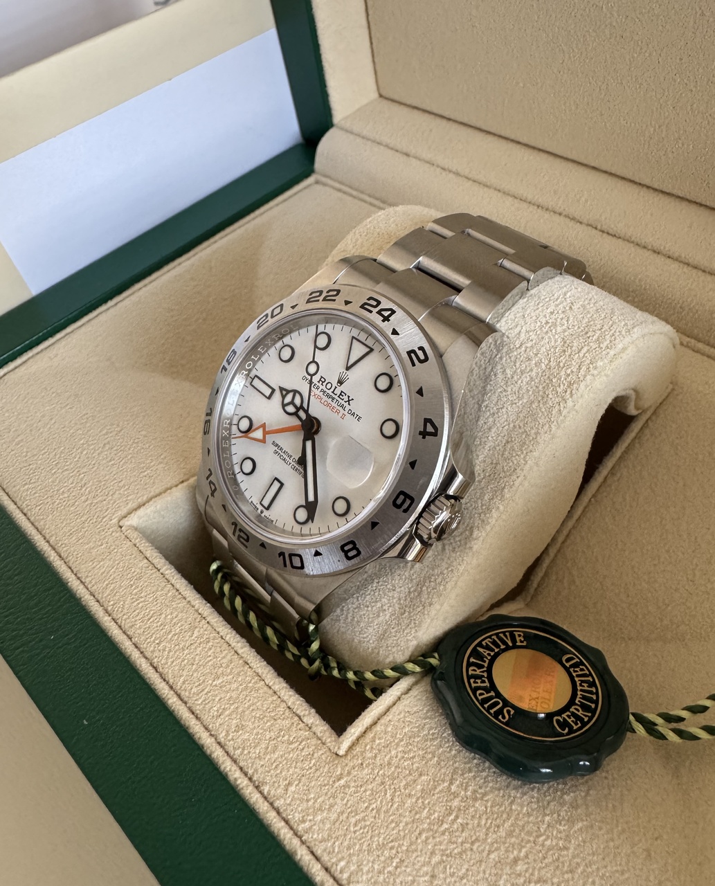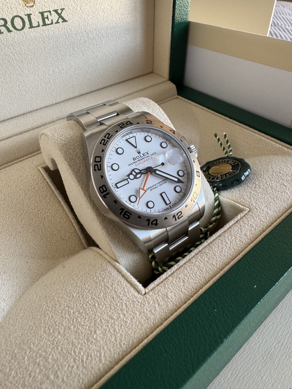 Продаю свои Rolex Explorer II 226570 “Polar” с белым матовым циферблатом, одна из наиболее востребованных и ликвидных конфигураций линейки.