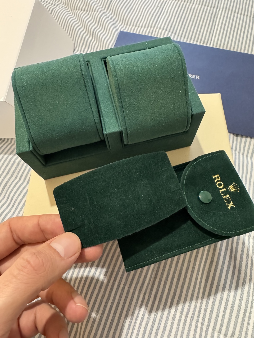 Полный комплект: коробки, документы, все звенья. В подарок подставка для часов от легендарного Les Ambassadeurs (куплена у них при ликвидации; логотип был снят, к сожалению) и фирменный travel pouch Rolex.