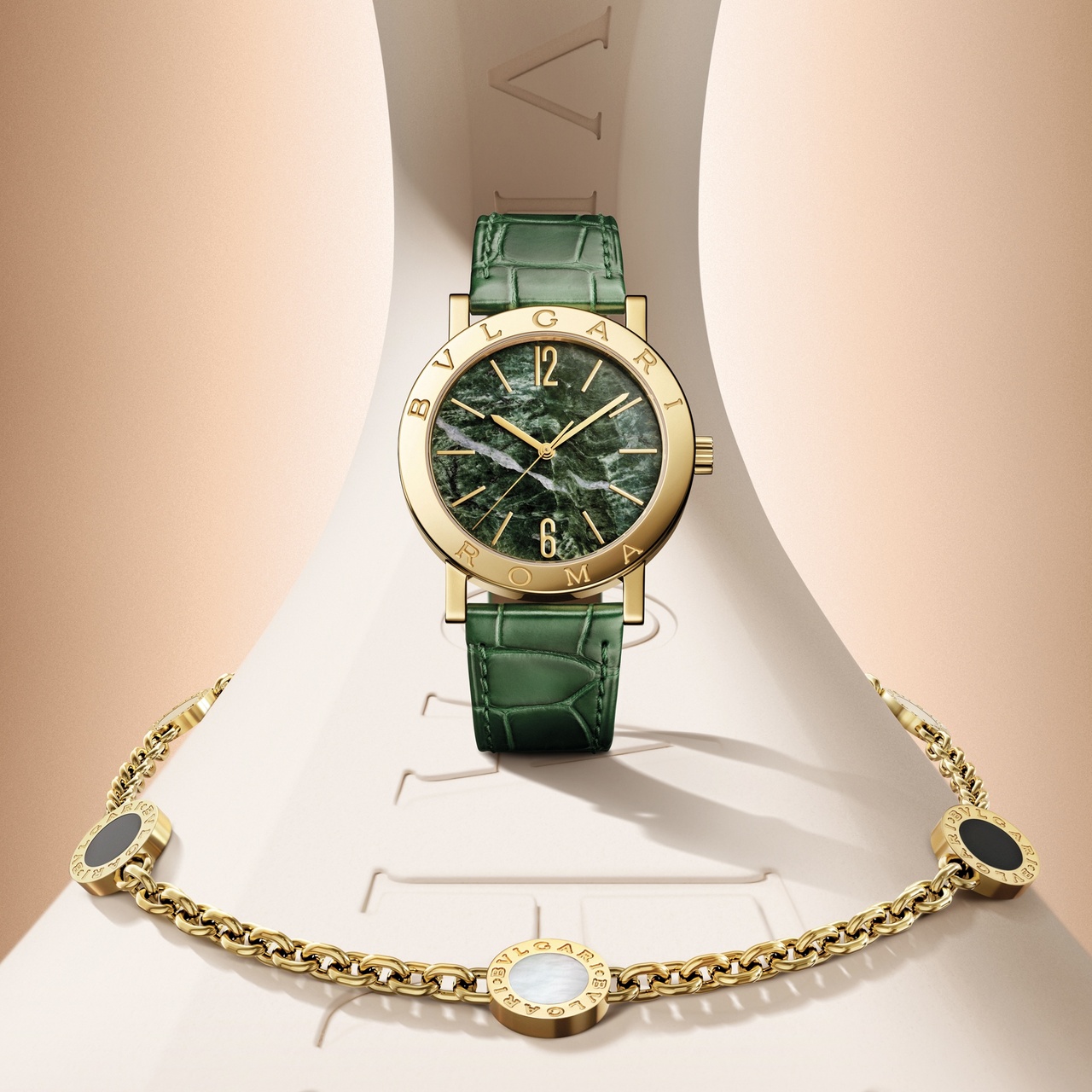 Безель Bvlgari Bvlgari дерзко красуется именем бренда, выгравированным на манер древнеримских монет, утверждая неповторимую индивидуальность часов. Характерный шрифт в древнеримском стиле, появившийся у Дома в 1934 году во время реконструкции флагманского бутика Via Condotti, с тех пор стала его визитной карточкой. Помимо характерного написания лого, дизайн часов глубоко укоренен в визуальном языке Вечного города, его силуэт перекликается с мраморными колоннами Пантеона, перистилями монументальной архитектуры Рима. Представляя циферблаты из натурального камня, Дом предлагает потрясающую новую трактовку к 50-летию коллекции.