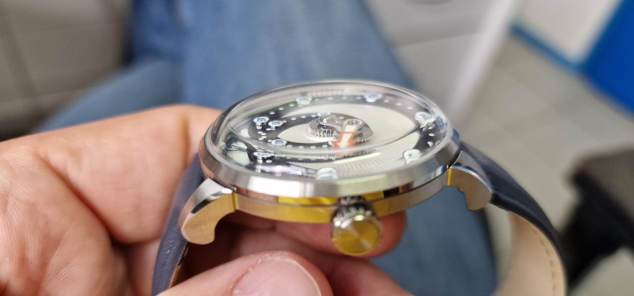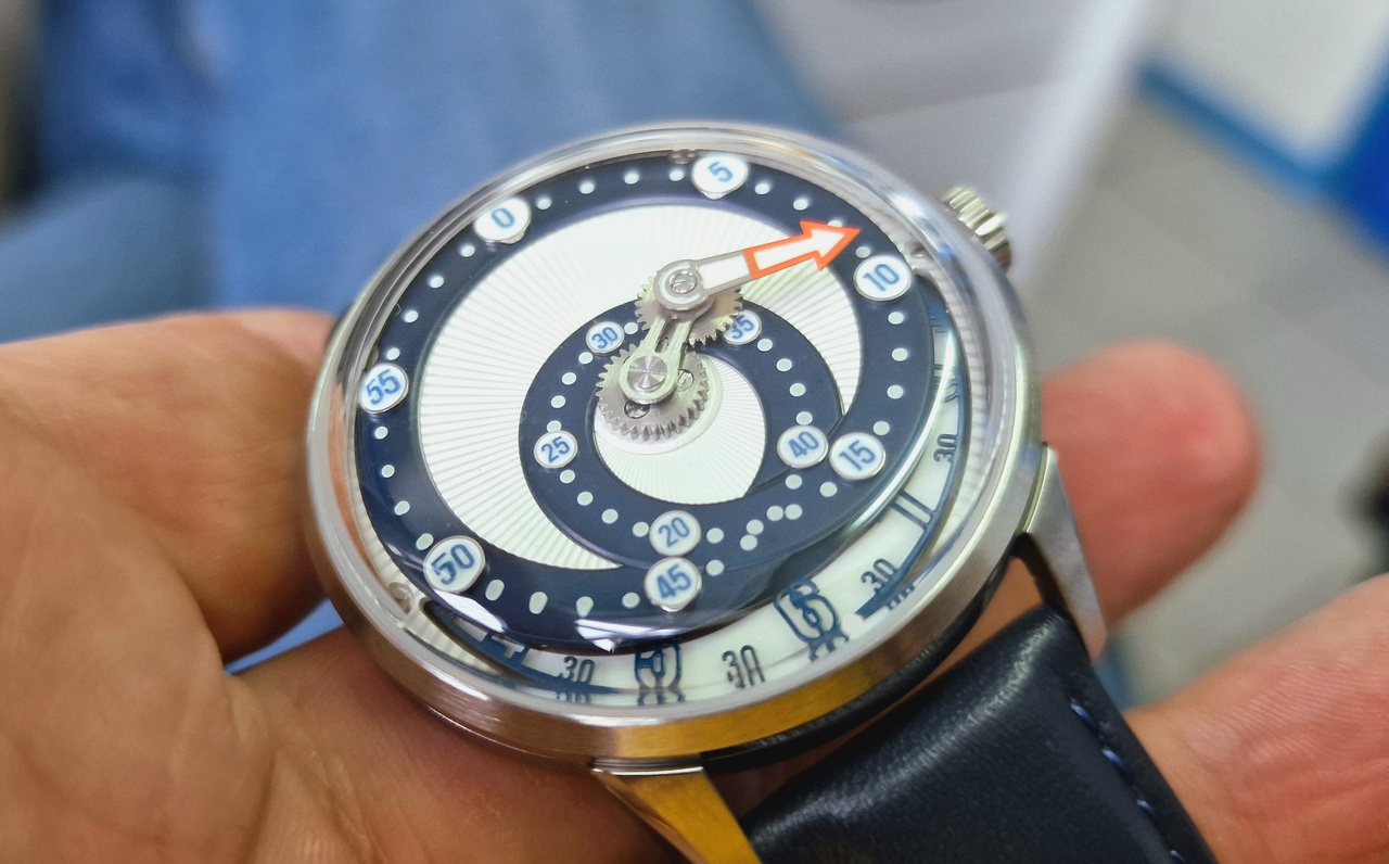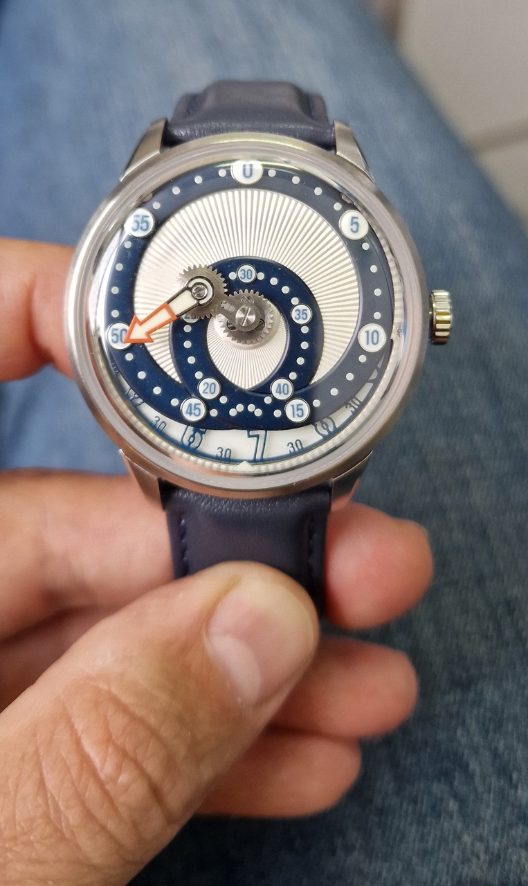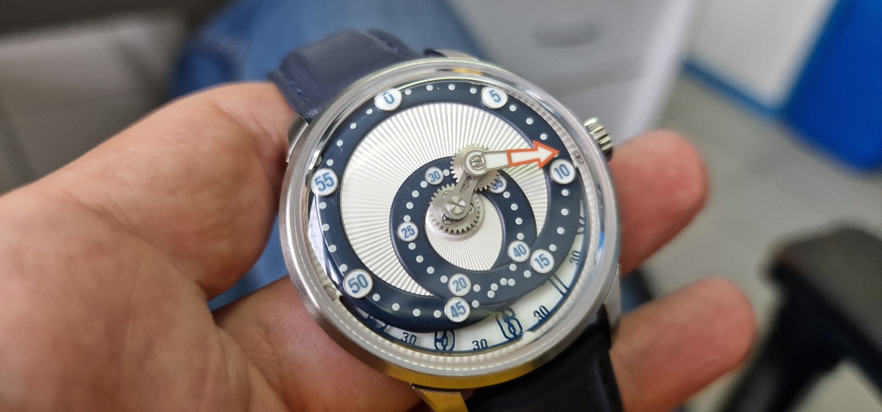 Оригинальная идея криволинейного движения минутной стрелки выполнена на высоте. Внутри беспроблемная Miyota 9015, сверху купольный сапфир с антибликом. Сделаны, прямо скажем, прилично.
